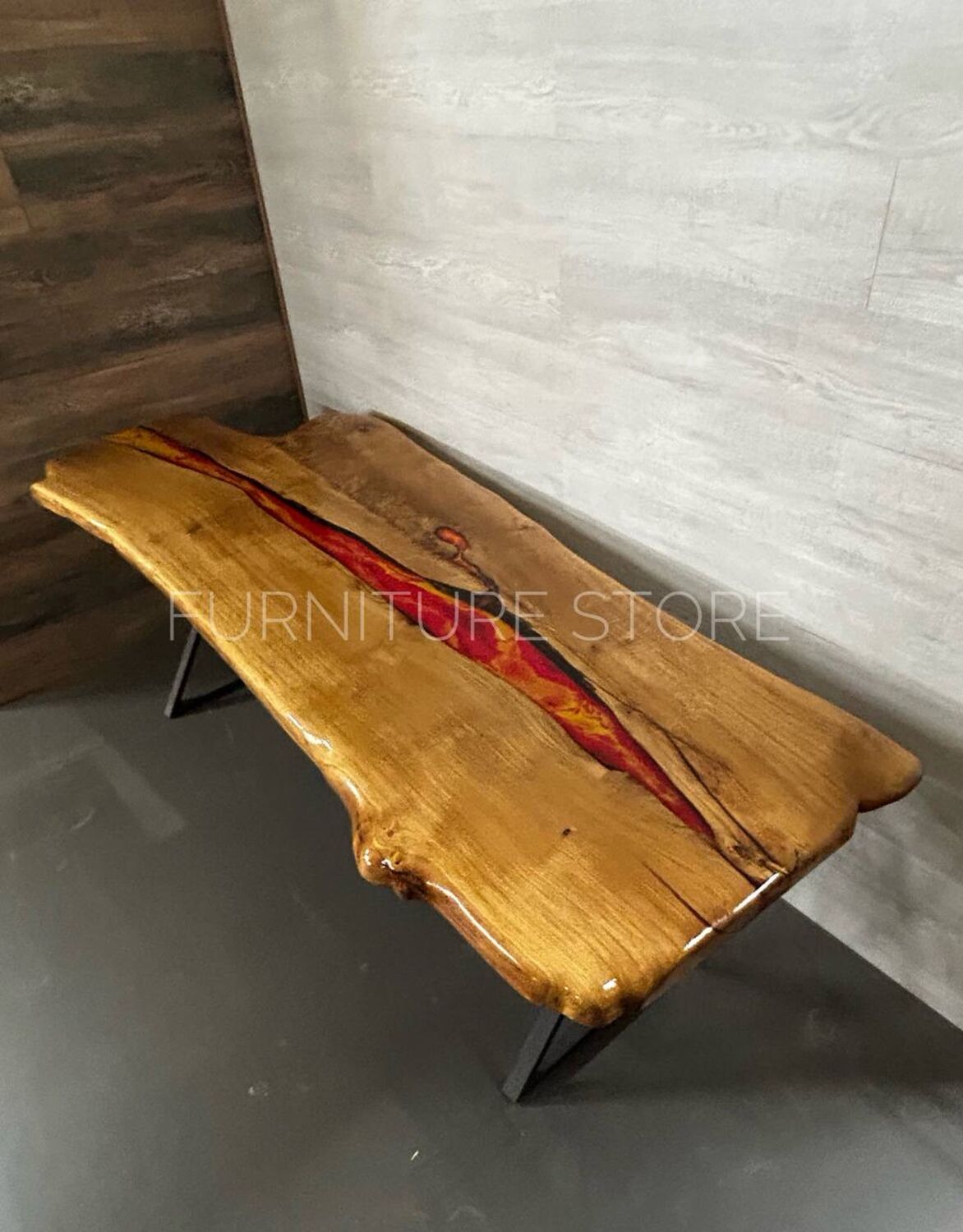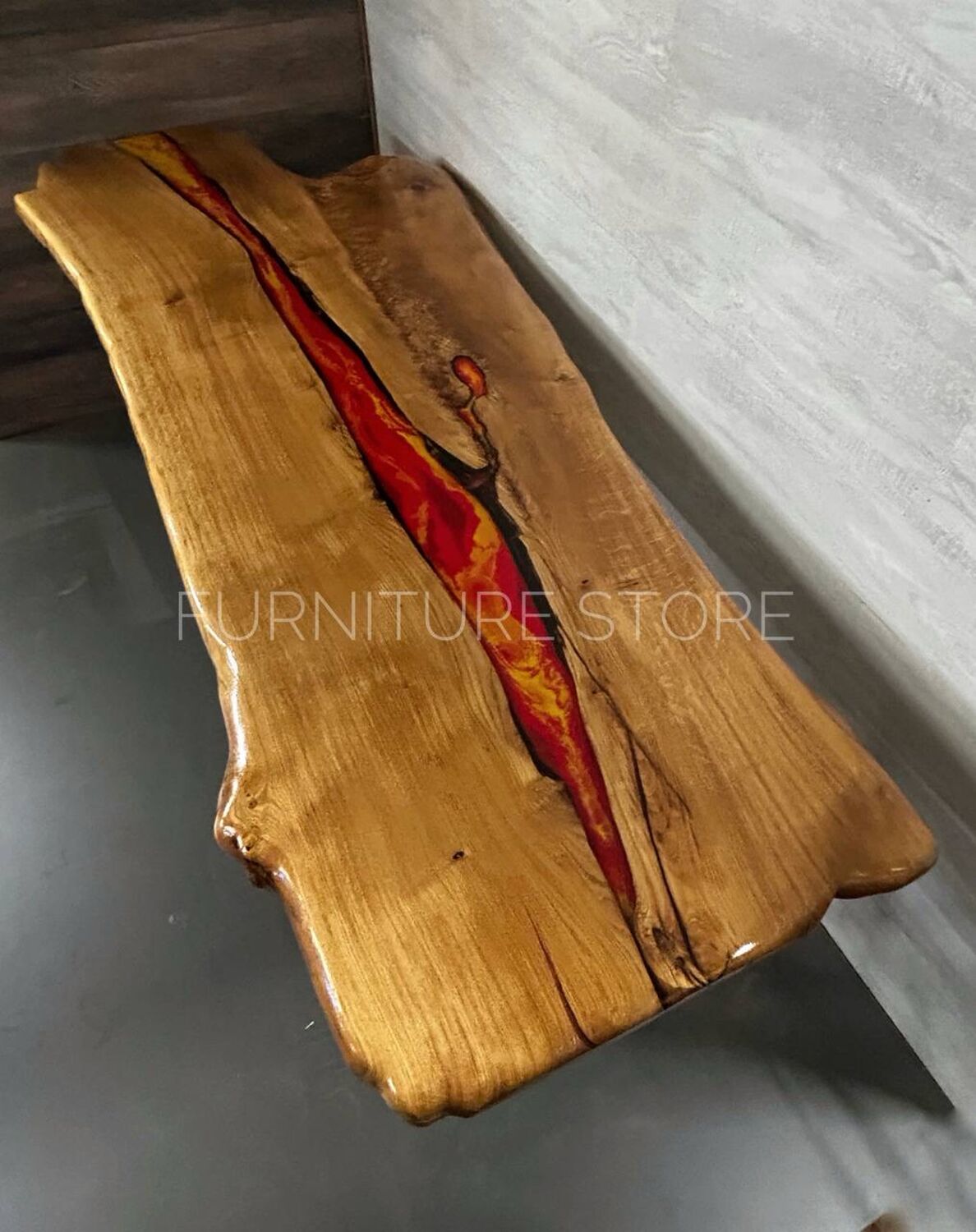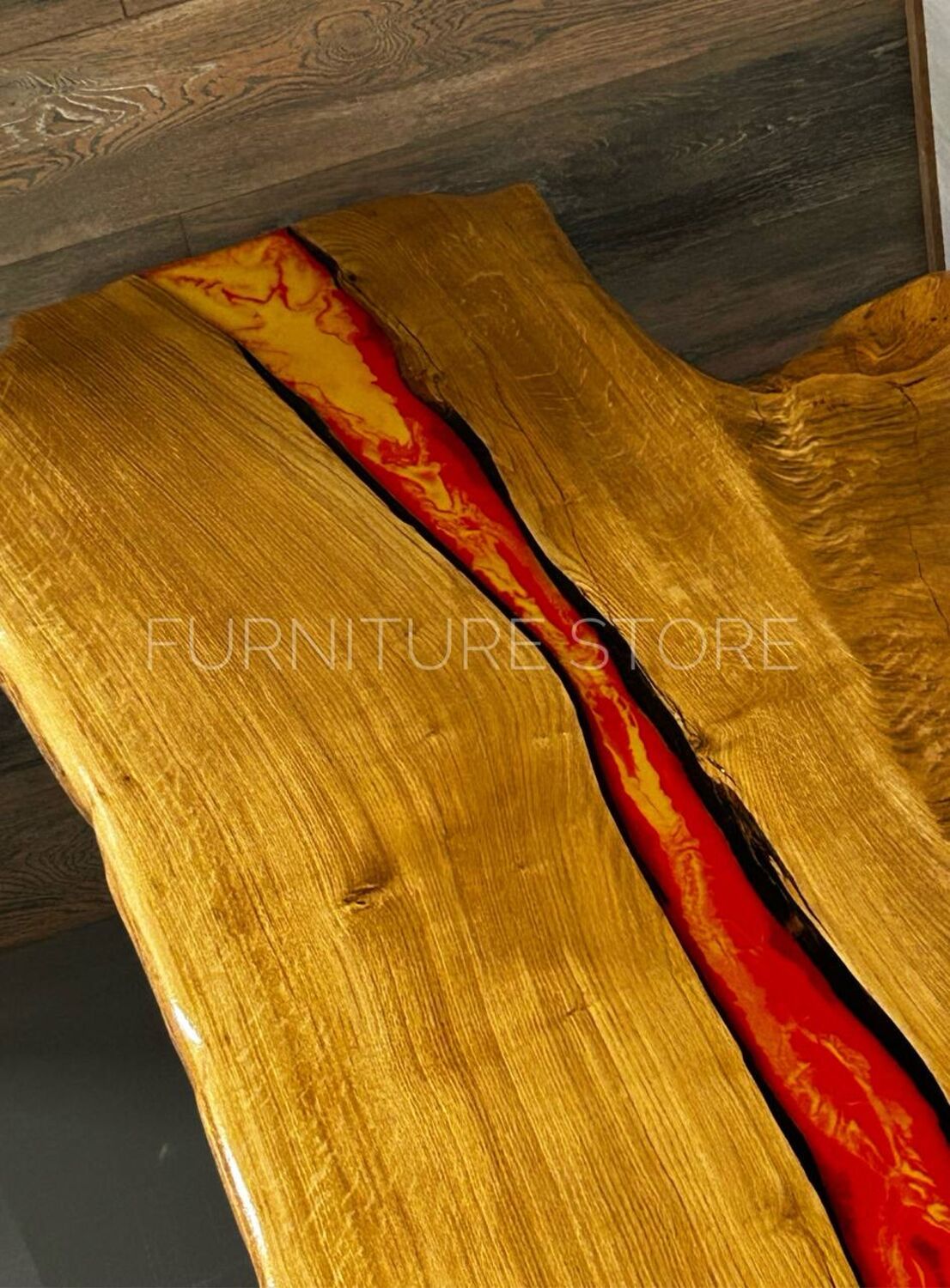 Центральный акцент — заливка эпоксидной смолой в стиле «лава». Яркие красно-оранжевые потоки смолы словно пронизывают древесину, создавая ощущение раскалённой магмы, застывшей внутри дерева. Эффект достигается за счёт многослойной заливки и тщательно подобранных оттенков, которые придают композиции объём и динамику. Используется эпоксидная смола с повышенной устойчивостью к ультрафиолету, что обеспечивает стабильность цвета на долгие годы.