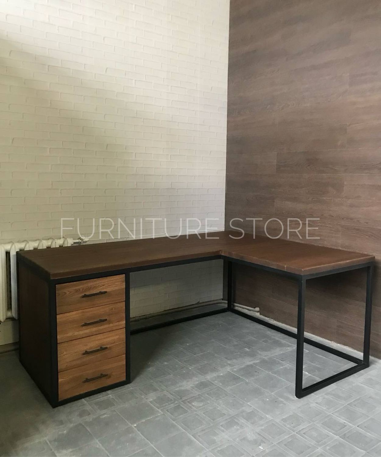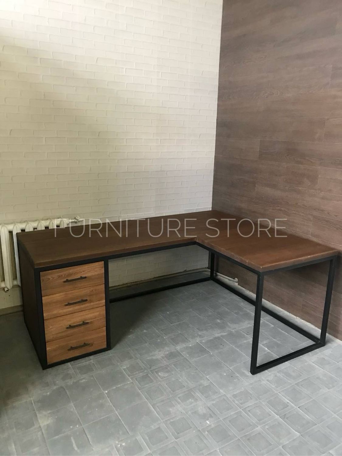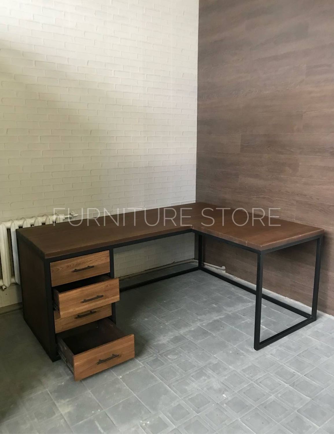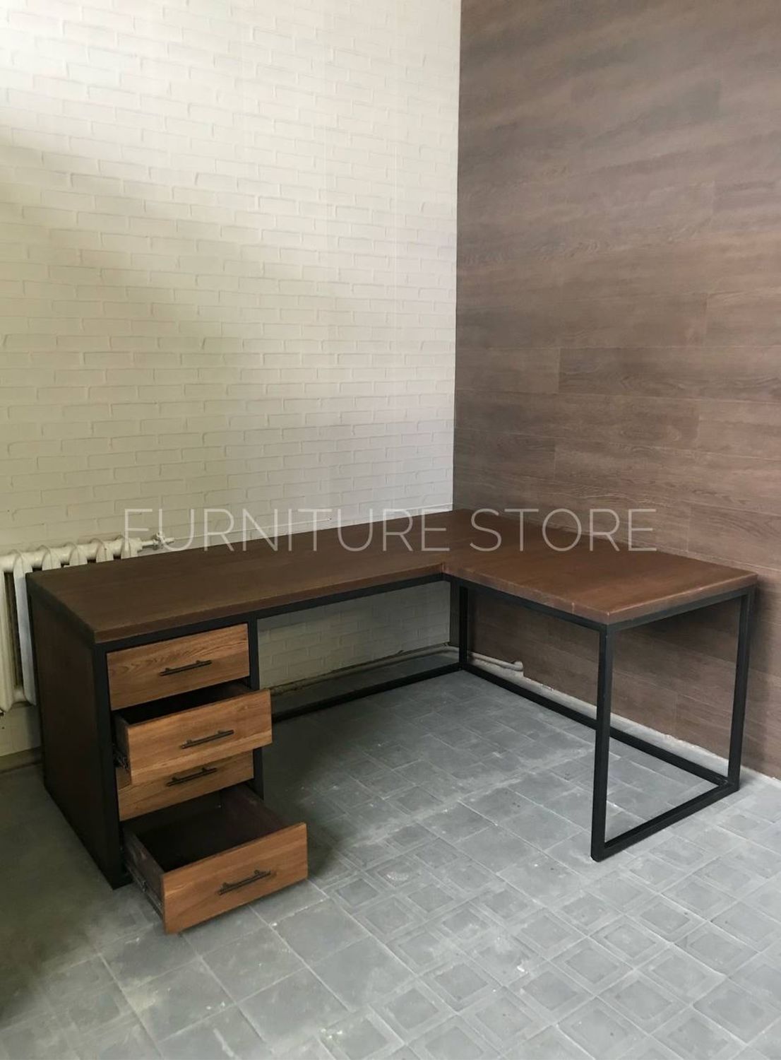 Угловой рабочий стол с выдвижными ящиками на направляющих с доводчиками изготовлен из массива ясеня и металлического профиля.