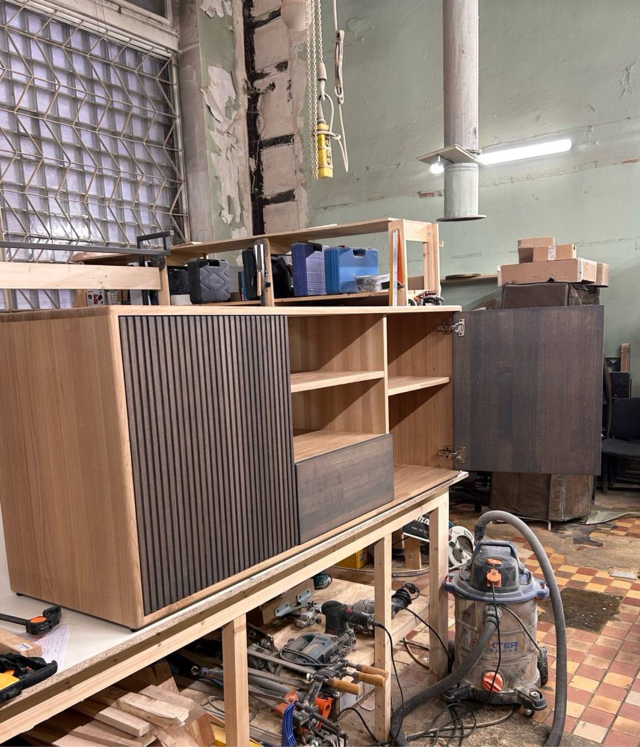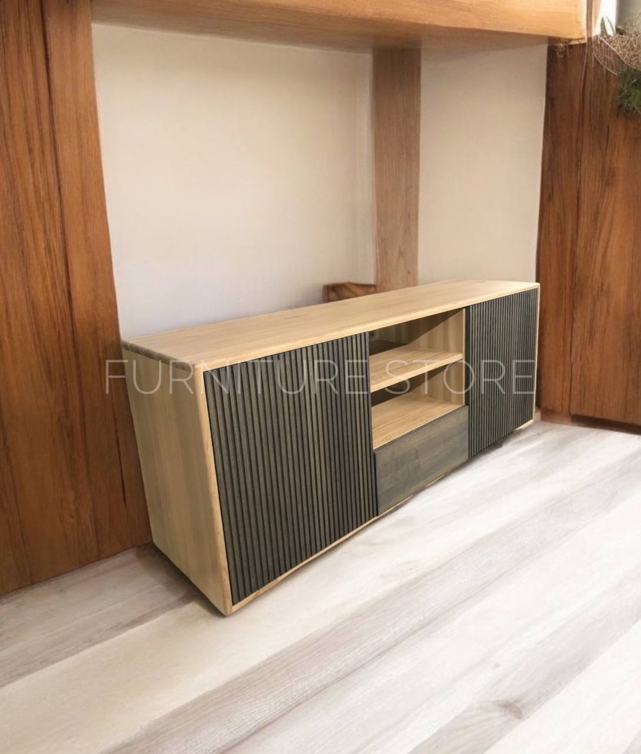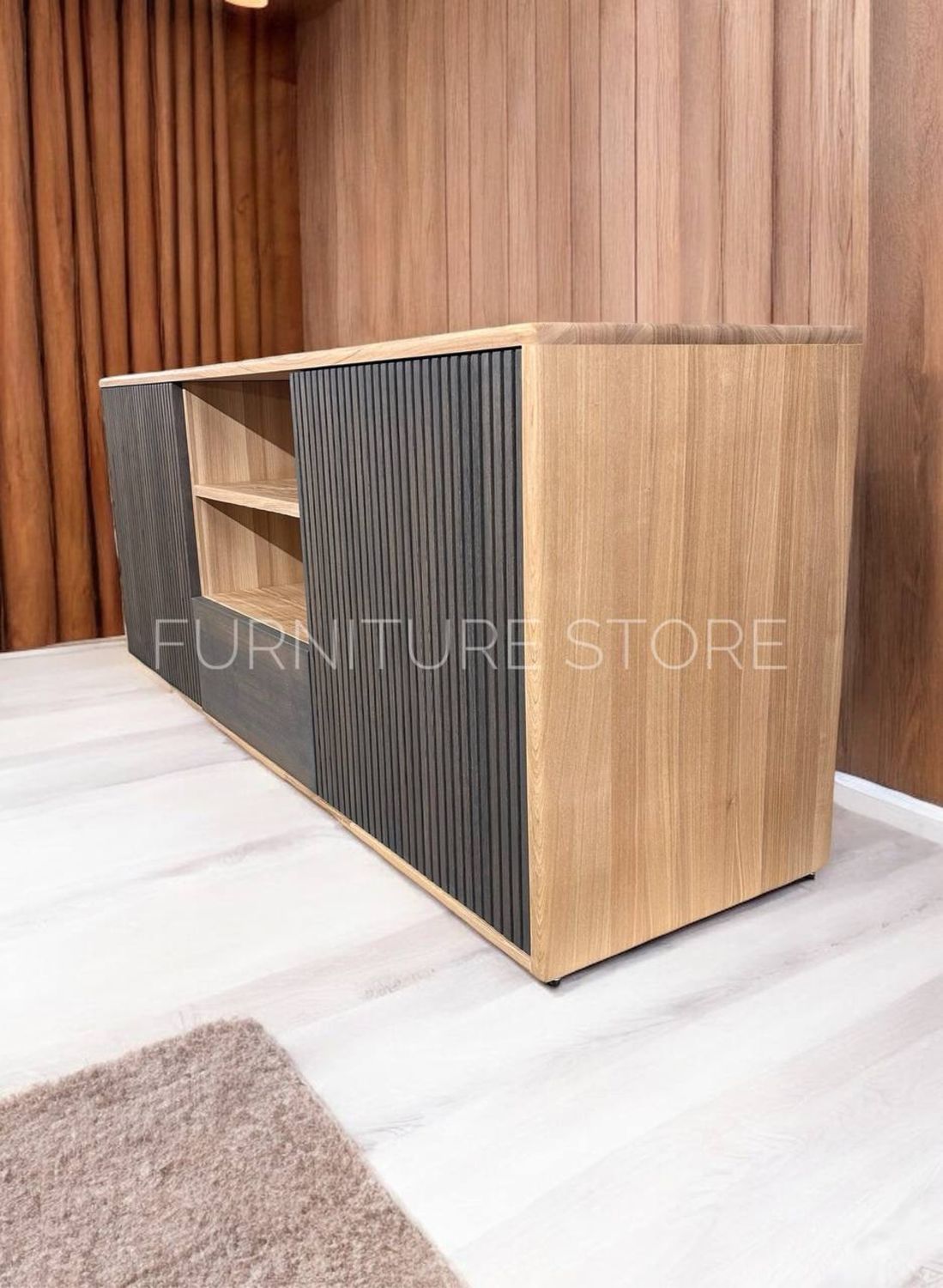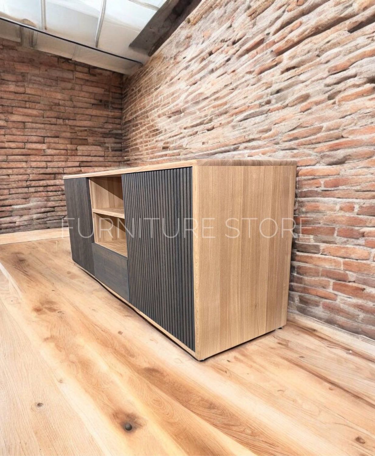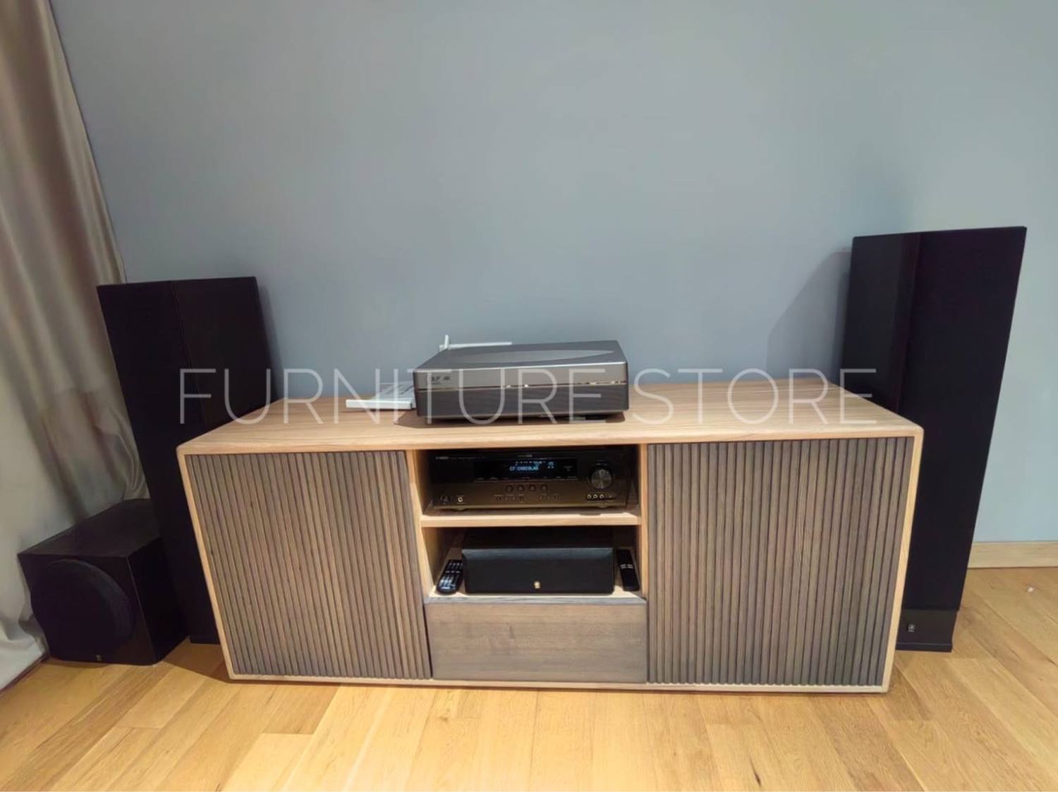 Тумбав стиле сканди под телевизор изготовлена из массива цельноламельного ясеня. В тумбе предусмотрен выдвижной ящик на направляющих с доводчиками, открытые и закрытые полки. В работе использовано тонирующее масло по дереву.