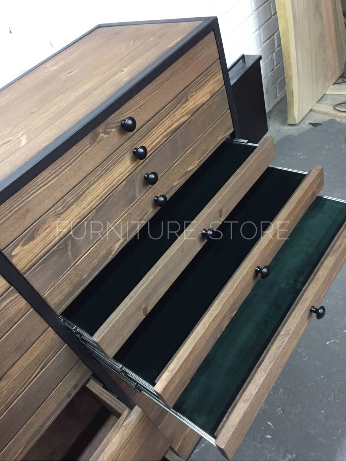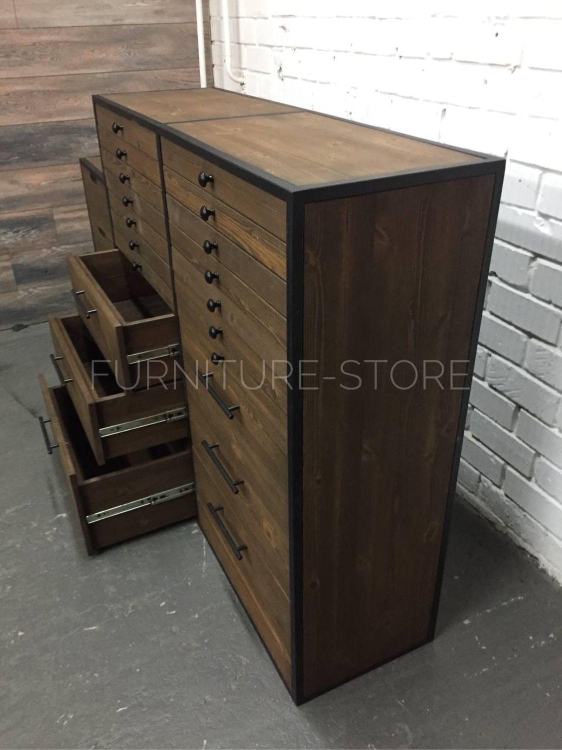 Картотека в стиле лофт выполнена из массива сосны и металлического профиля. Выдвижные ящики оснащены направляющими с доводчиками. Сосна покрыта тонирующим маслом по дереву. Металлический профиль покрыт порошковой краской по металлу.