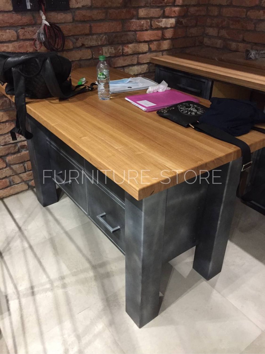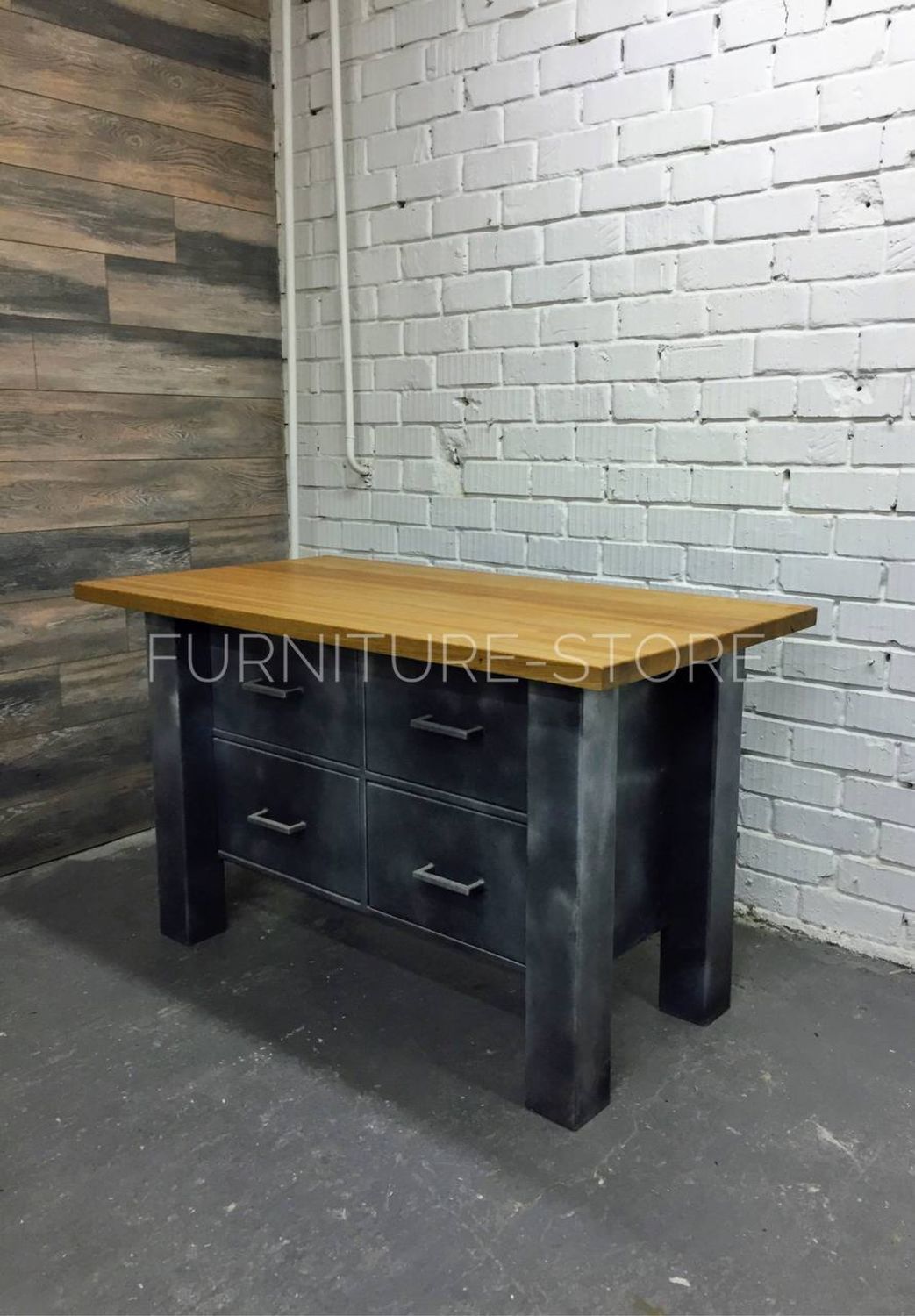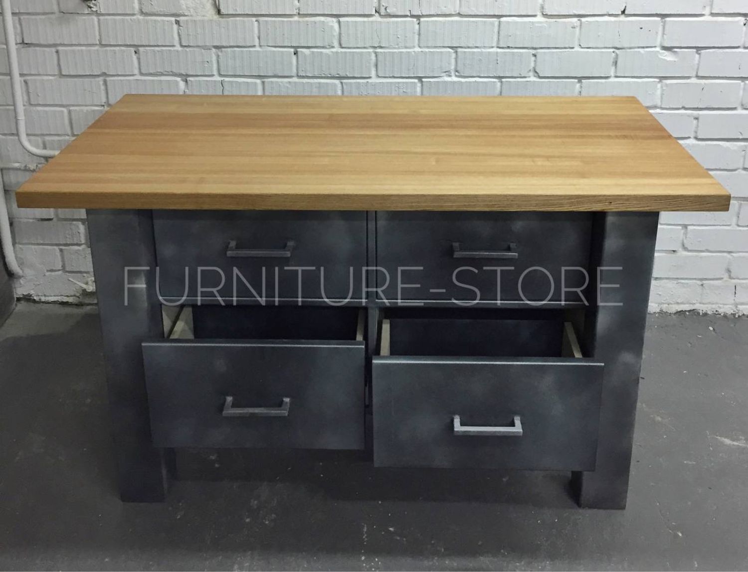 Тумба в стиле лофт для кухни выполнена из металла. Верх тумбы (столешница) изготовлен из массива ясеня. Ясень покрыт тонирующим маслом по дереву и мебельным лаком. В работе с металлом использована техника патинирования поверхности. Выдвижные ящики оснащены направляющими с доводчиками.