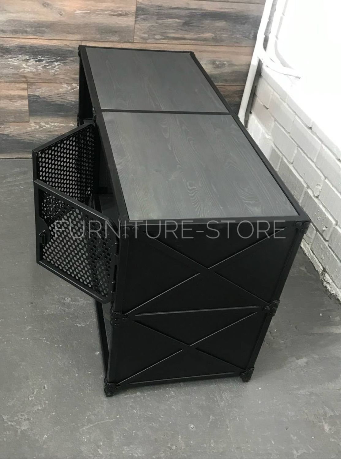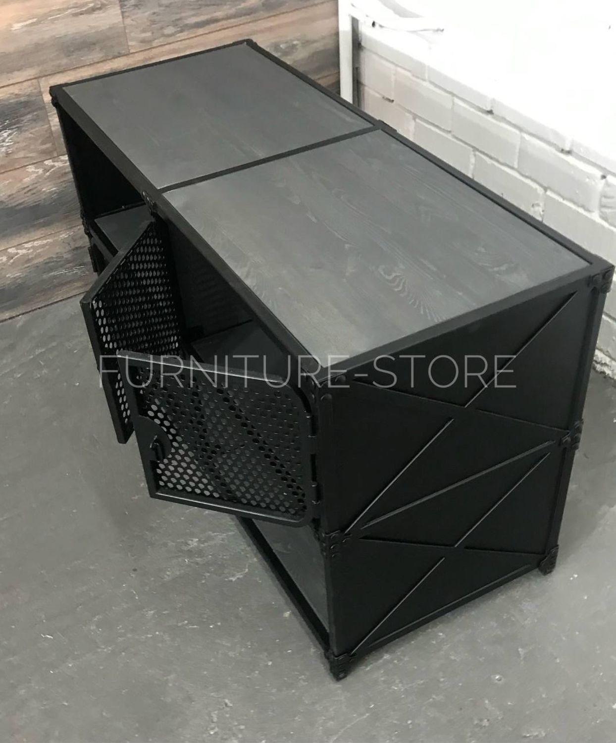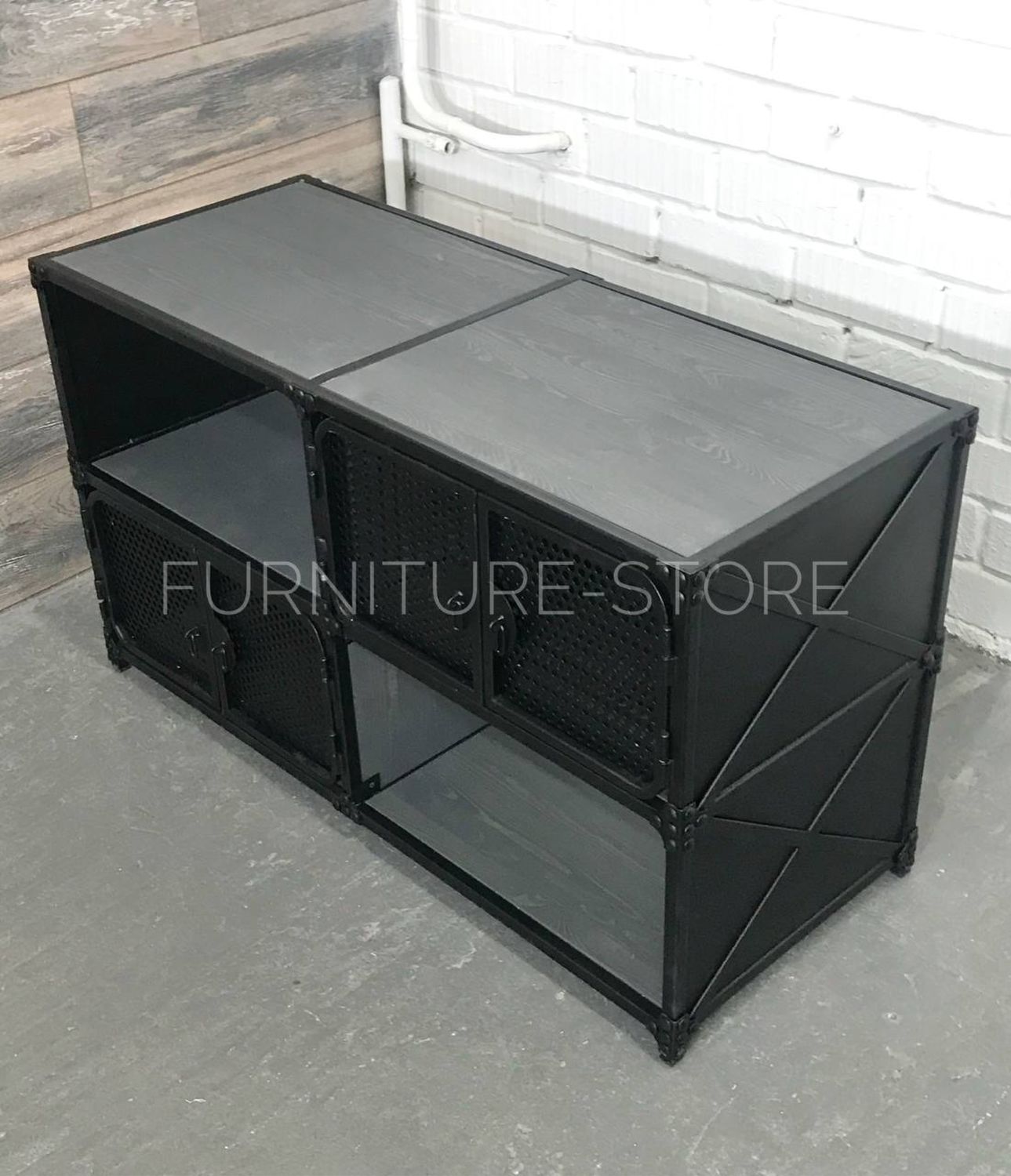 Тумба в стиле лофт под телевизор с открытыми и закрытыми полками изготовлена из металла и сосны. Каркас тумбы выполнен из металлического профиля, дверцы декорированы перфолистом, металлическими уголками и клёпками. Дерево покрыто тонирующим маслом "варатан", металл покрыт порошковой краской "чёрный муар". На заказ изменим размеры и цвет. Изготовим мебель лофт по Вашим эскизам.