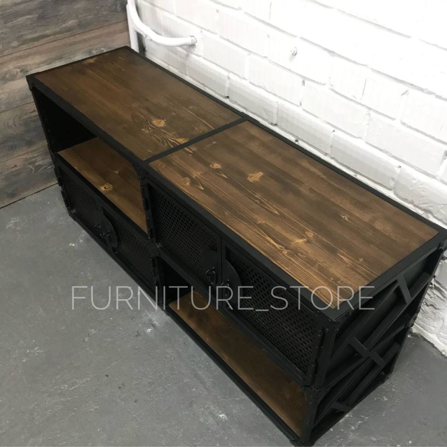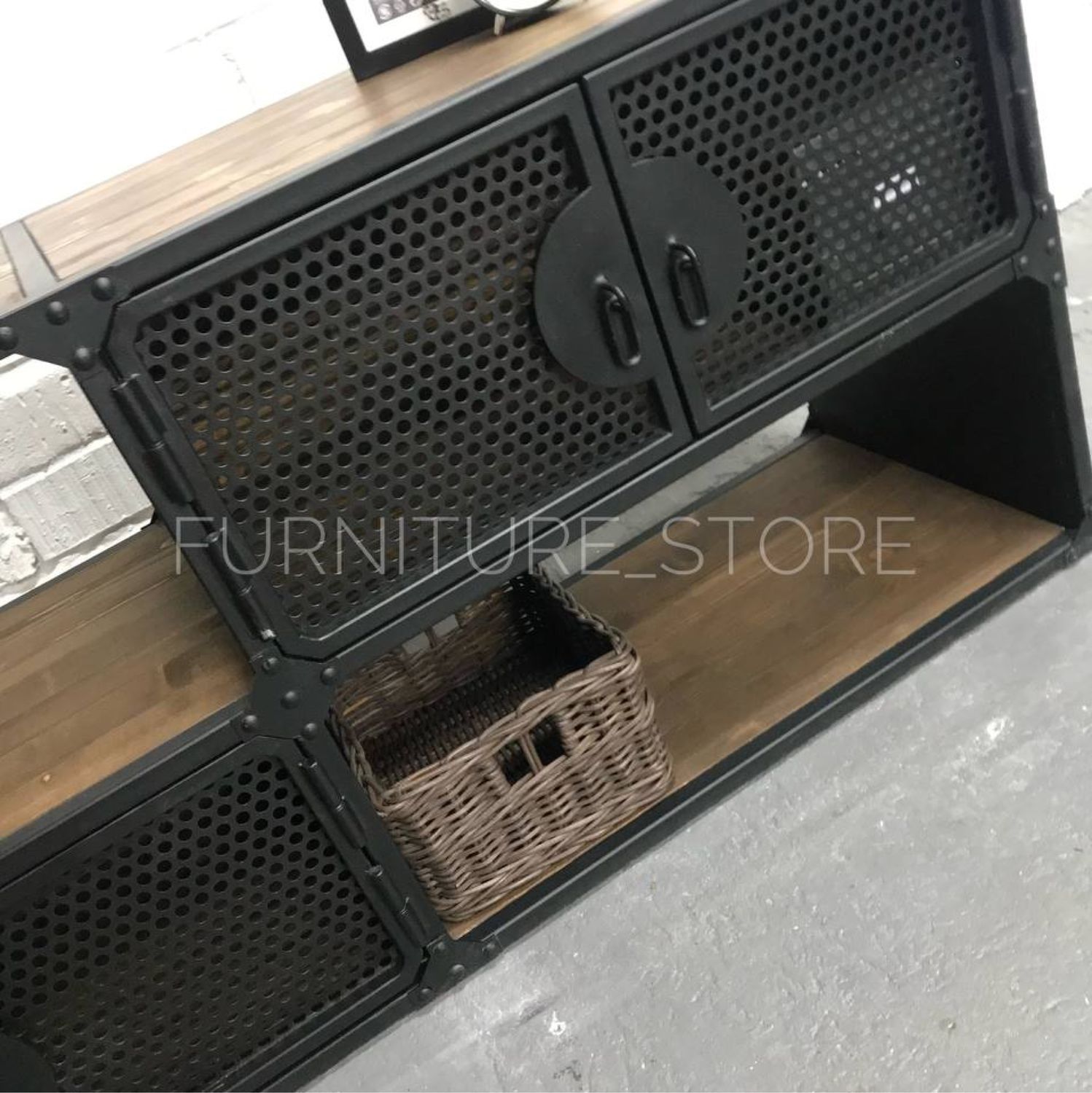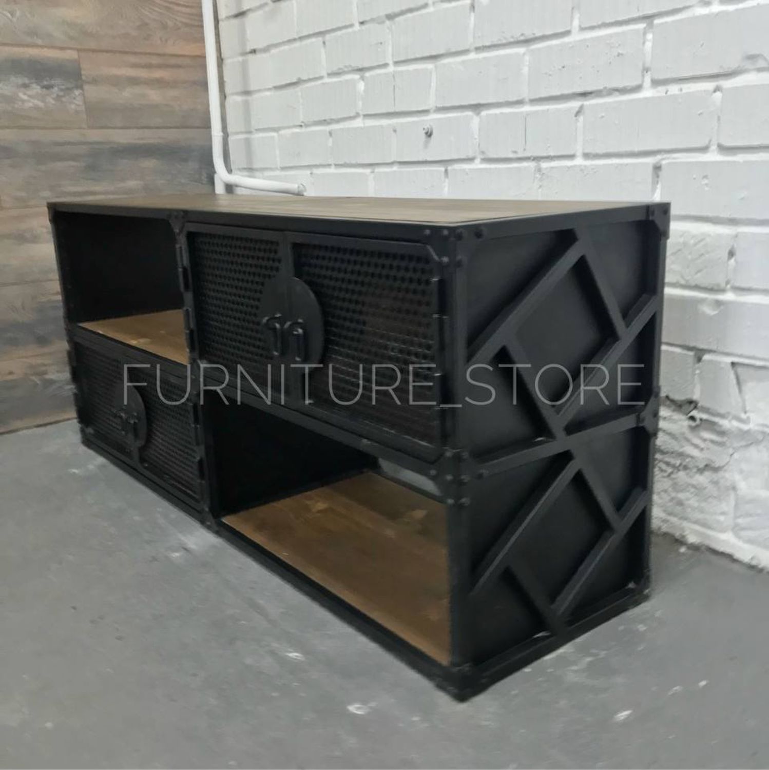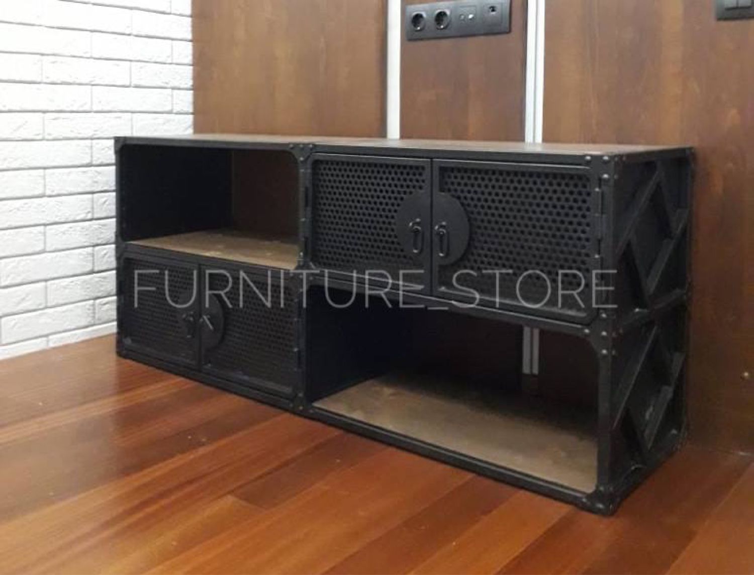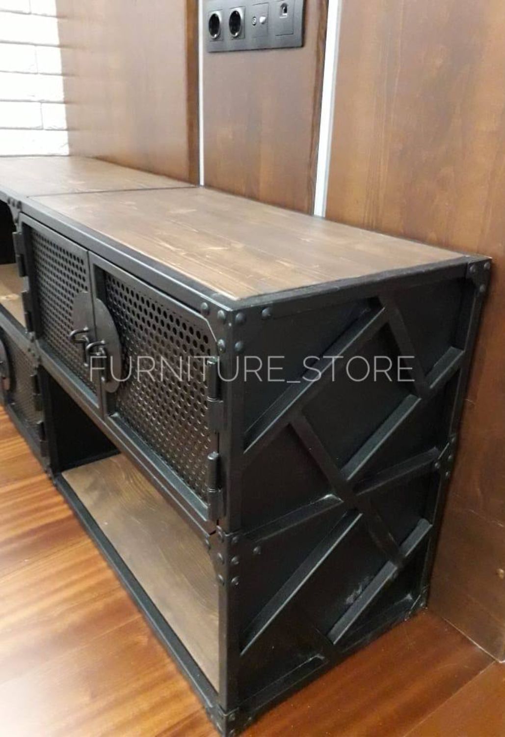 Тумба в стиле лофт под телевизор с открытыми и закрытыми полками изготовлена из металла и сосны. Каркас тумбы выполнен из металлического профиля, дверцы декорированы перфолистом, металлическими уголками и клёпками. Дерево покрыто тонирующим маслом "варатан", металл покрыт порошковой краской "чёрный муар". На заказ изменим размеры и цвет. Изготовим мебель лофт по Вашим эскизам.