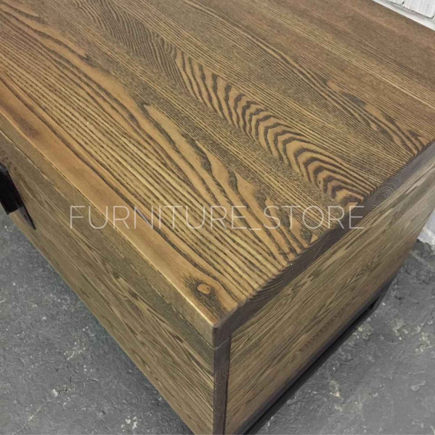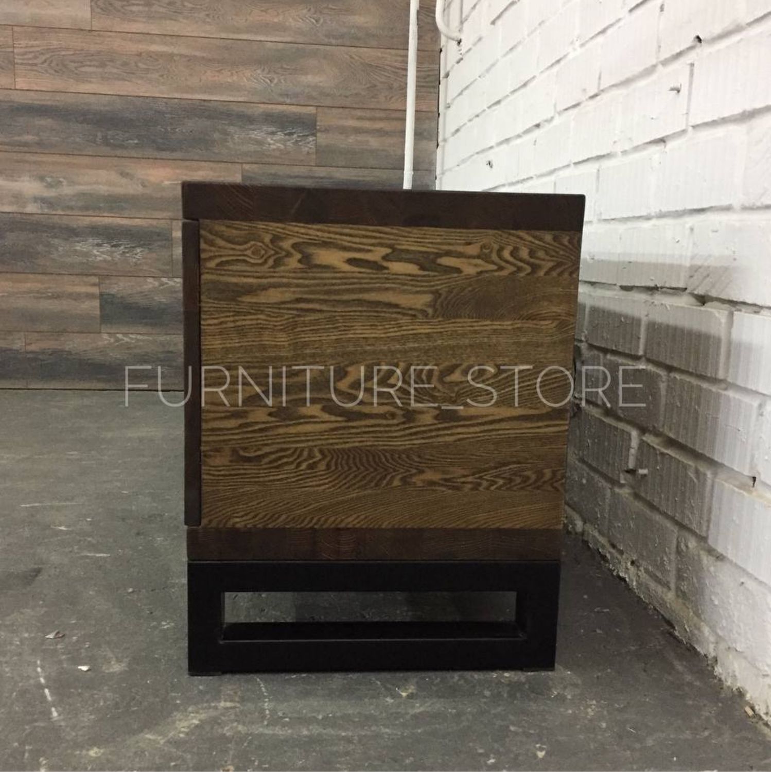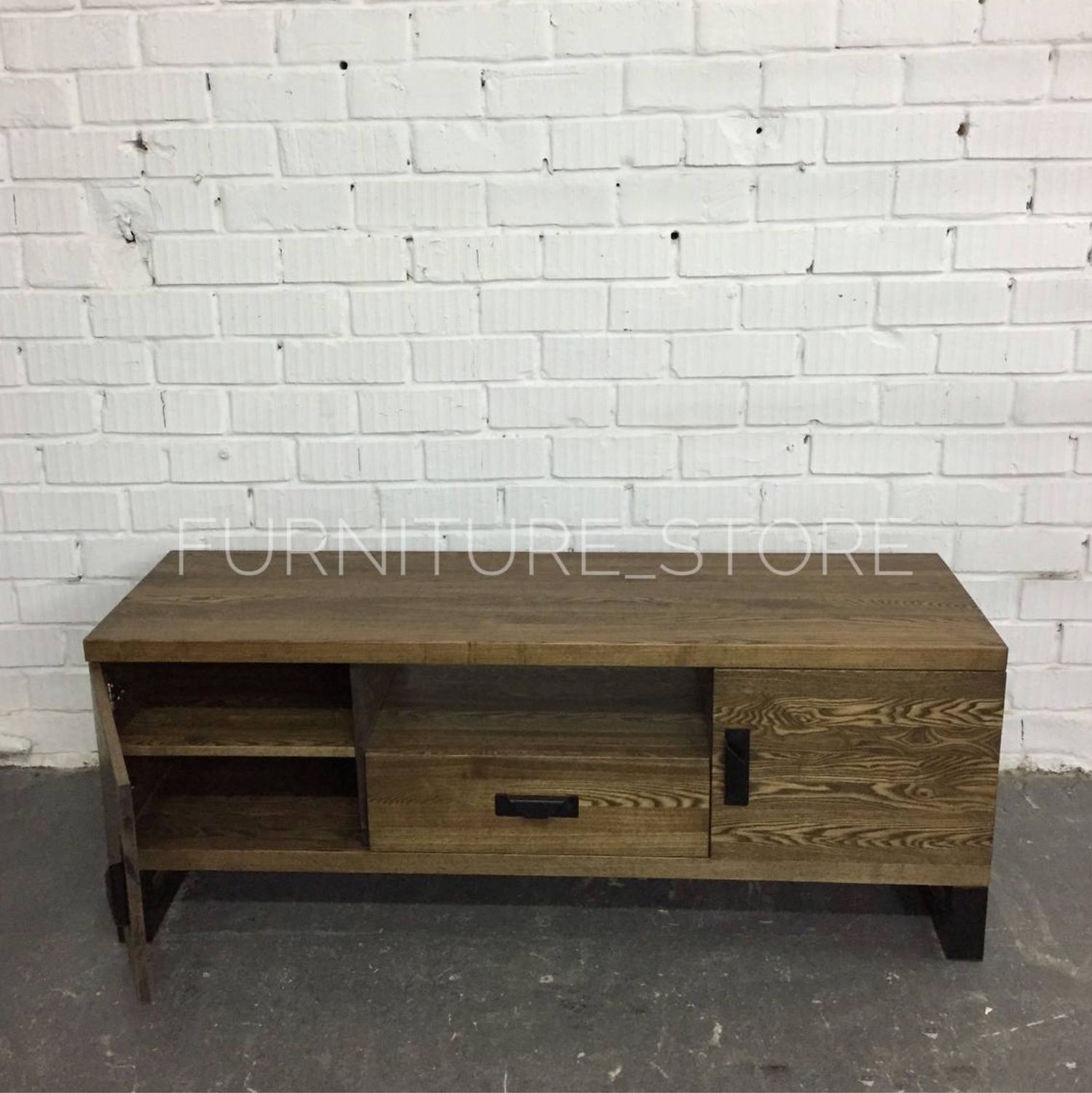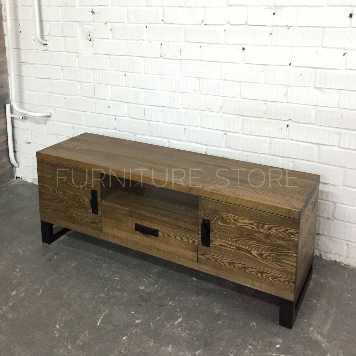 Тумба в стиле лофт на металлических ножках под телевизор изготовлена из массива ясеня. Дизайн тумбы предусматривает открытую и закрытые полки, выдвижной ящик на направляющих с доводчиками. Массив дерева покрыт тонирующим маслом, металлический профиль покрыт антивандальной порошковой краской по металлу.