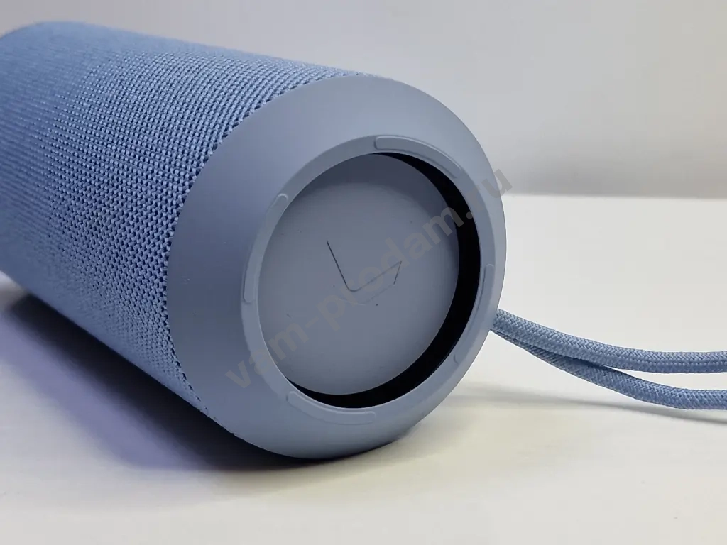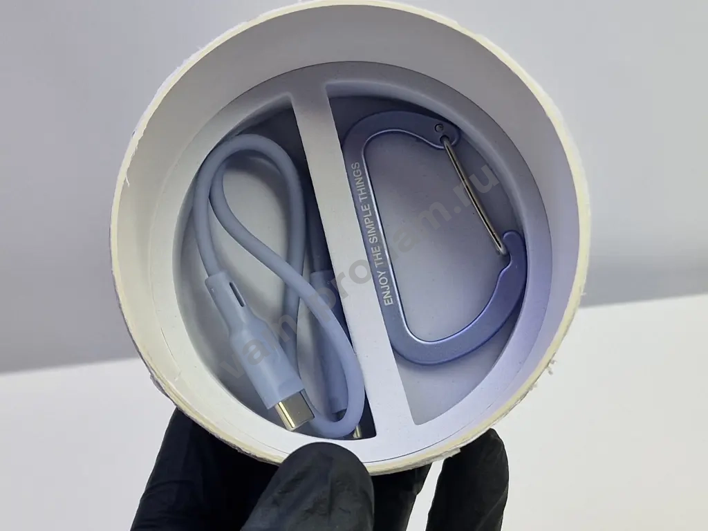 Колонку можно установить вертикально, горизонтально или закрепить на сумке с помощью карабина и прочного шнура. Они входят в комплект вместе с USB-C кабелем для зарядки.