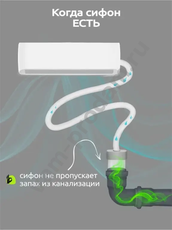 Сифон для отвода конденсата в канализацию в системах кондиционирования. Сифон оснащен механическим запирающим устройством, не пропускающим запах из канализации при высыхании воды в гидрозатворе. Высота гидрозатвора 40 мм.