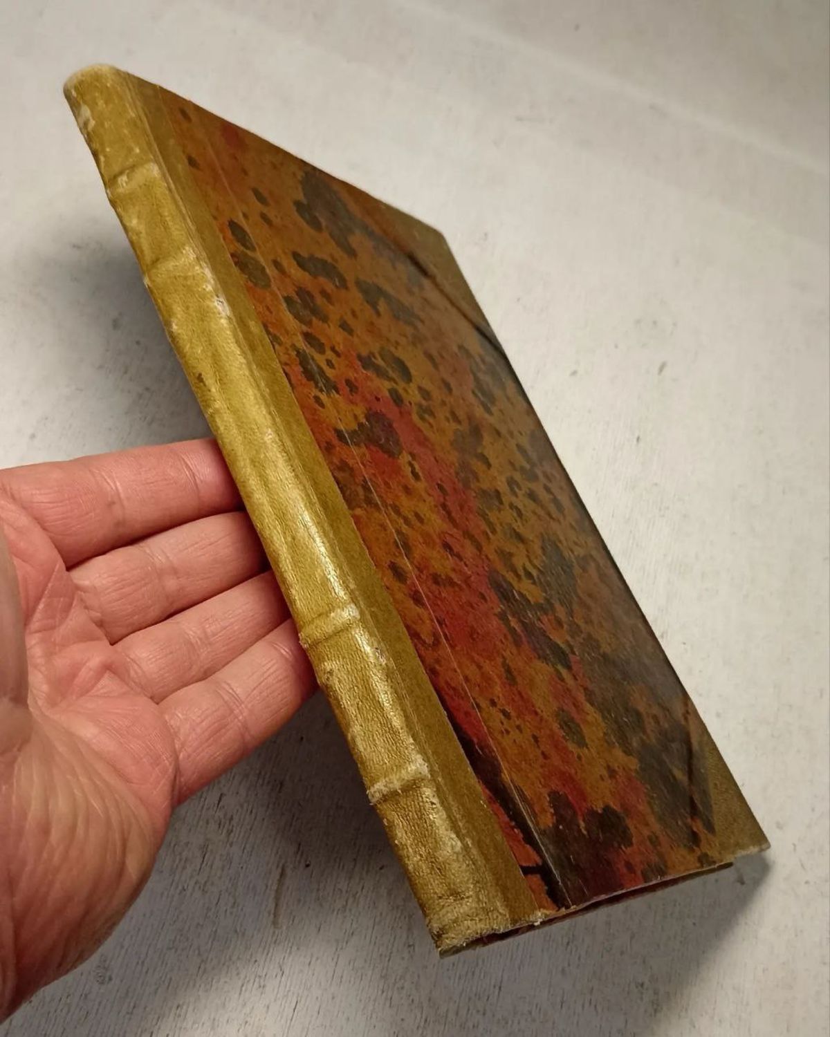 Книжный блок почти в очень хорошем состоянии, от времени немного потемнела бумага и поля страниц, периодически встречаются пятнышки, три листа неровно разрезаны в типографии, на аертикальном поле есть небольшие утраты (текст не задет). Переплет немного ослаблен, разлом по нахзацу, намечается разлом по форзацу.