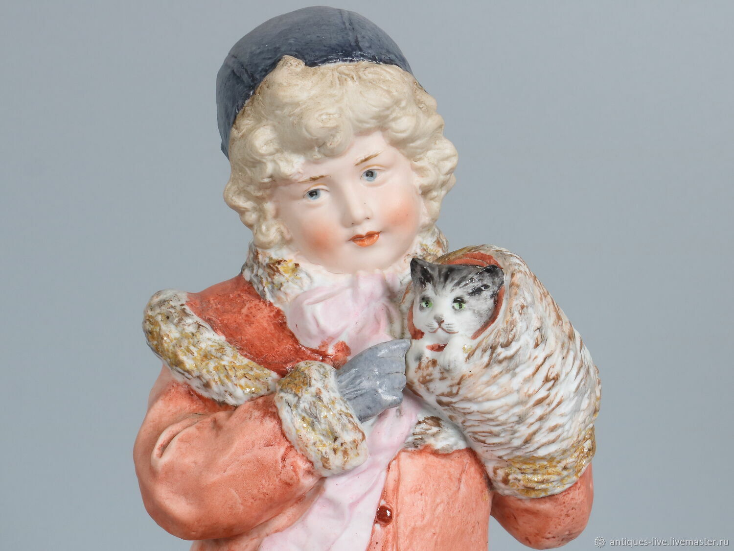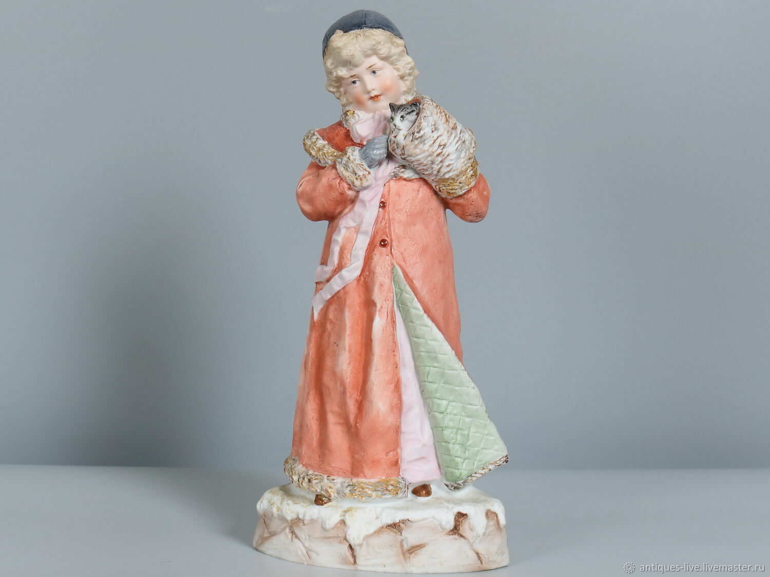 Мастерски выполненная статуэтка, что безусловно является отличительной чертой работ известнейшей немецкой мануфактуры Gebruder Heubach. Очаровательная девочка согревает котенка в муфточке.