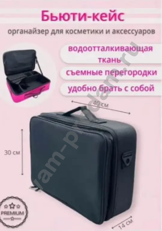 Бьюти-кейс для косметики в хорошем состоянии. Цвет — чёрный, подходит под любой стиль одежды. Размеры: высота 40 см, ширина 30 см, глубина 14 см (с учетом расширения). Подходит для хранения и защиты косметических средств.