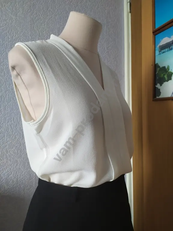 Блузка с шалевым воротником, из фактурной ткани, без рукавов, прямого кроя.