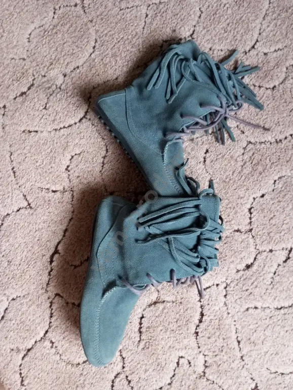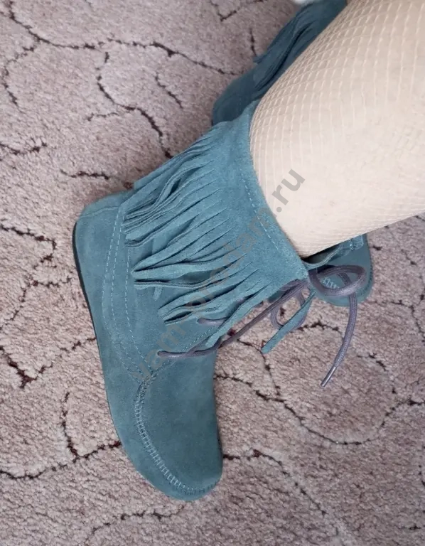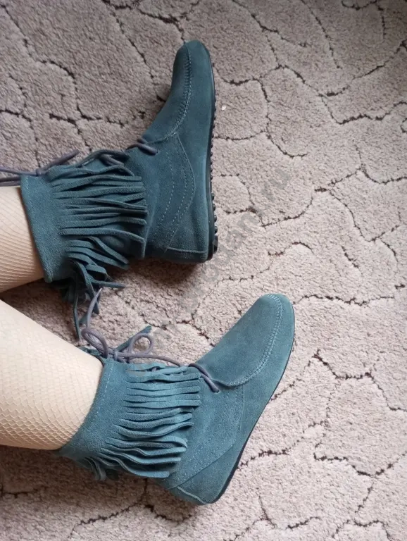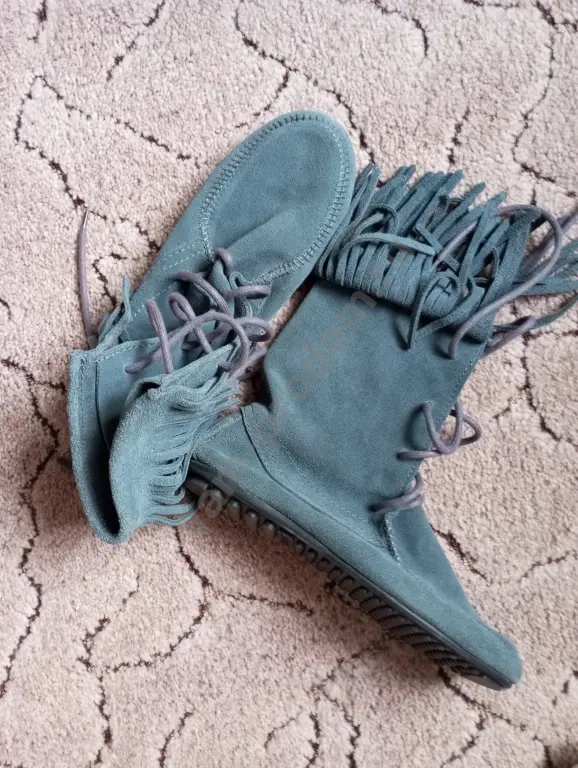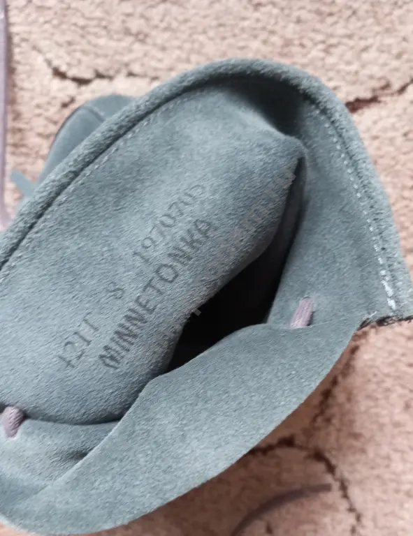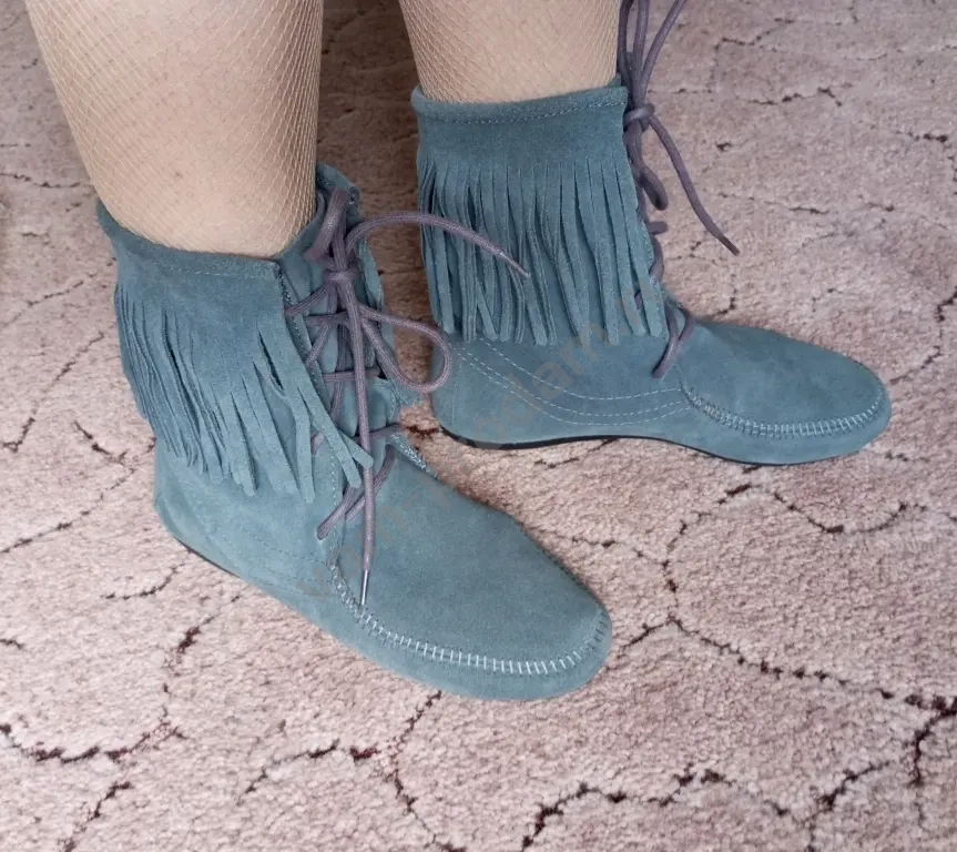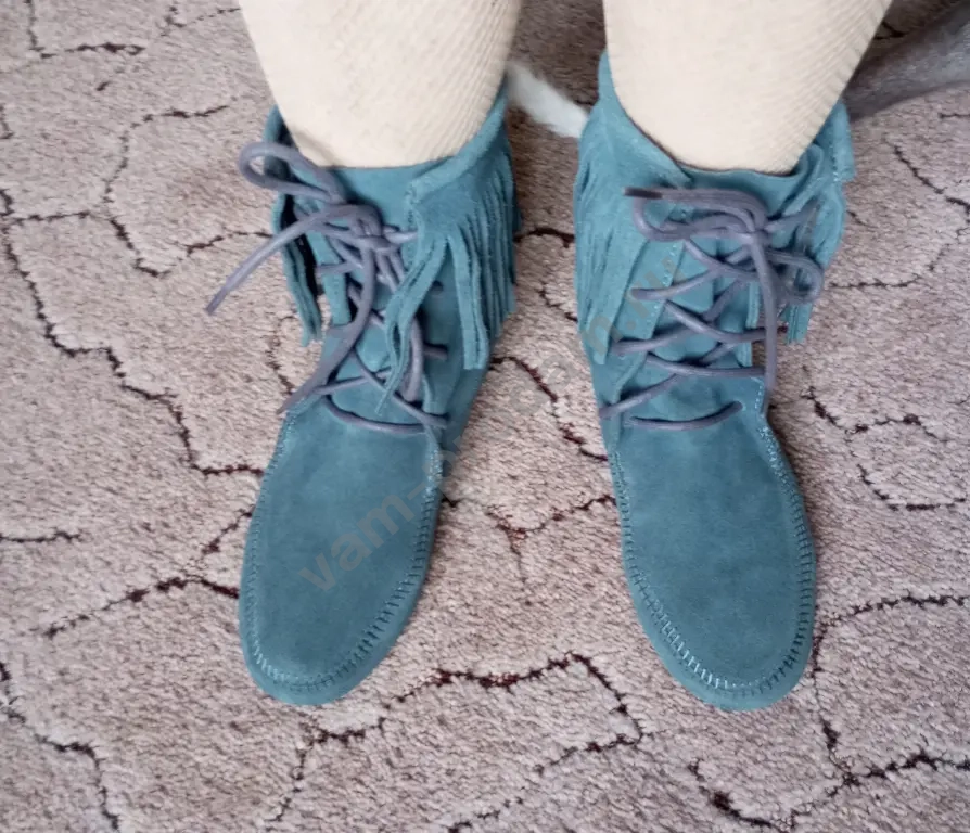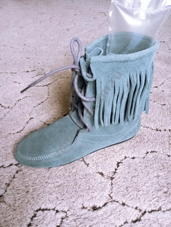 Замечательные сапожки Minnetonka. Размер 38 (длина стельки 24.5 см). Натуральная замша. Цвет серо-голубой. Очень мягкие, комфортные, просторные, пойдут на широкую стопу, в мыске и пяточке есть пространство, думаю, подойдут на стопу 25 см. Новые.