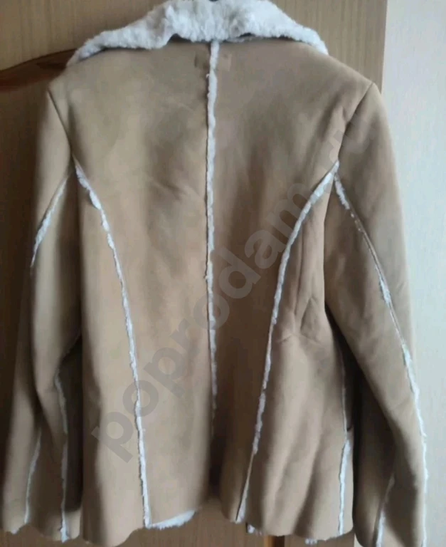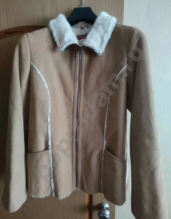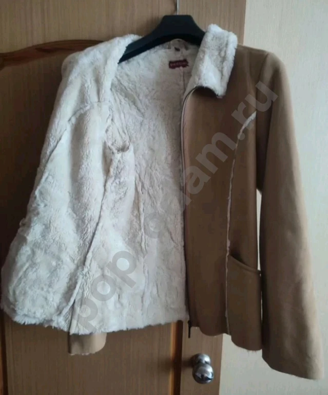 1. Искусственная замша+искусственный мех. Размер на русский 46-48 рост 176. Длина по спинке 70 см.