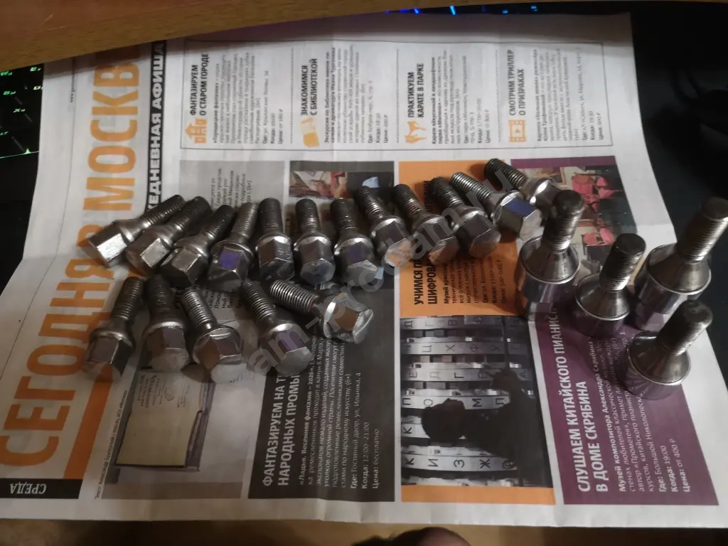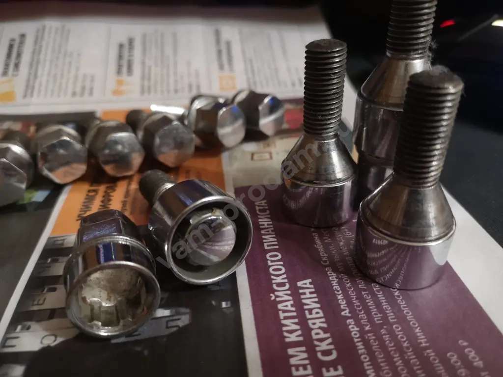 Комплект болтов на литые диски. Некоторые чуть подточены, доставали до механизмов стояночного тормоза. Длинные очень были. Плюс отдам комплект секреток и два к ним ключа. Состояние на 4. Все вместе за 500 рублей. Секретки отдельно дороже стоят. Соловьиный проезд 2