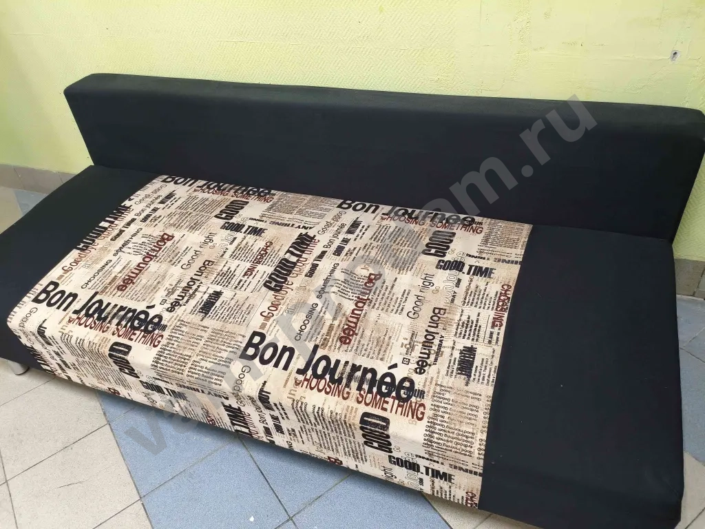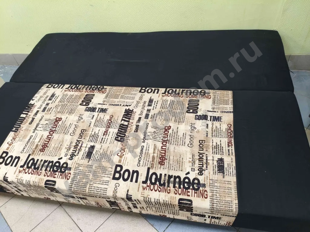 Продаётся удобный раскладной диван с мягким сиденьем и оригинальной обивкой с надписью "Bon Journee". Каркас в отличном состоянии, без повреждений. Диван легко трансформируется в спальное место размером , что обеспечивает комфортный отдых. Обивка имеет лёгкие следы использования на углах, но это не влияет на функциональность. В комплект входят подушки для спинки.