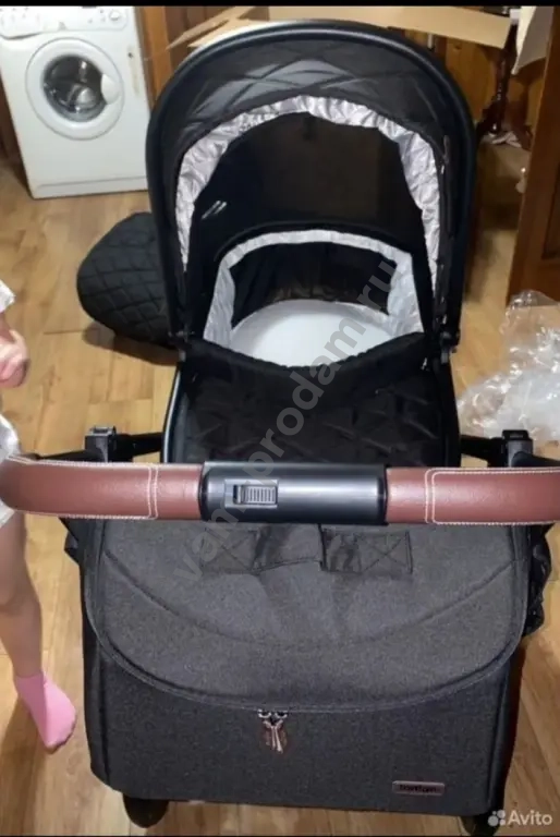 Ручка с отделкой из экокожи и декоративной прострочкой. Водонепроницаемая непродуваемая ткань со специальной пропиткой позволяет использовать коляску-люльку в любое время года как зимнюю, весеннюю, летнюю, осеннюю.