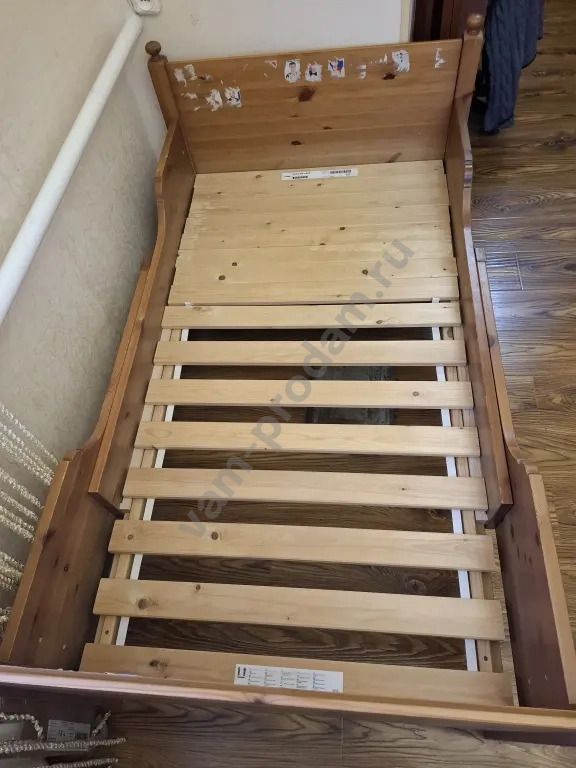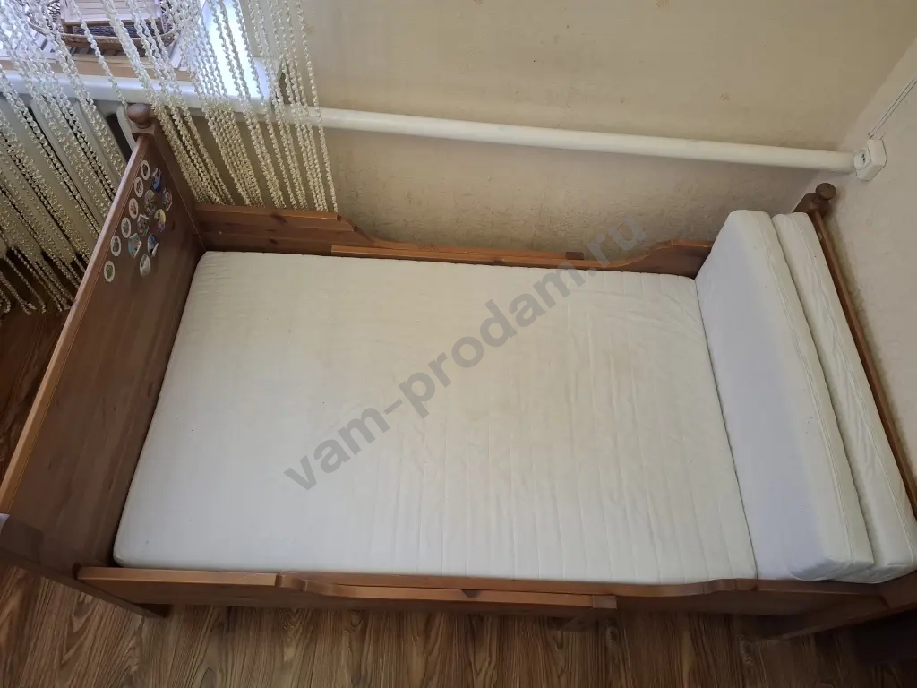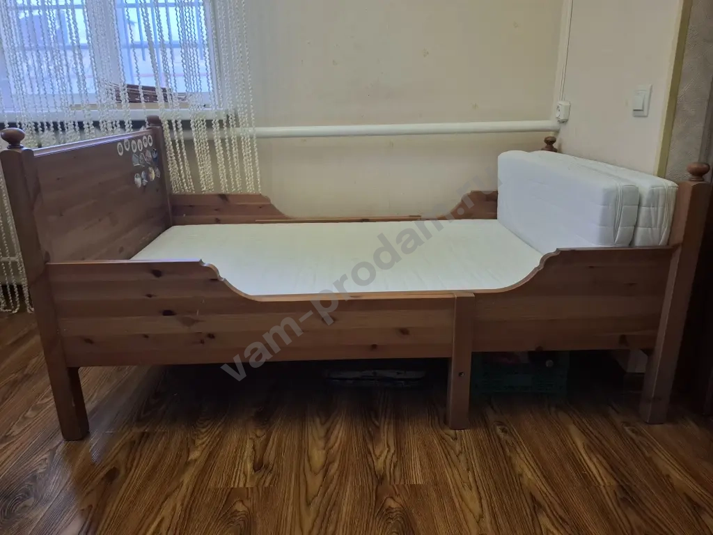 Продаётся раздвижная деревянная кровать IKEA. Размеры спального места регулируются в длину, что позволяет адаптировать её под ваши нужды. Кровать частично оснащена декоративной боковой спинкой и имеет высоту 78 см. Каркас выполнен из прочного дерева, что обеспечивает долговечность и устойчивость конструкции. В комплекте идёт матрас с дополнительными подушками, который добавит комфорта вашему отдыху. На ножках имеются мелкие царапины и сколы, но это не влияет на функциональность. На изголовье и изножье имеются несколько наклеек. Кровать находится в хорошем состоянии и готова к использованию.