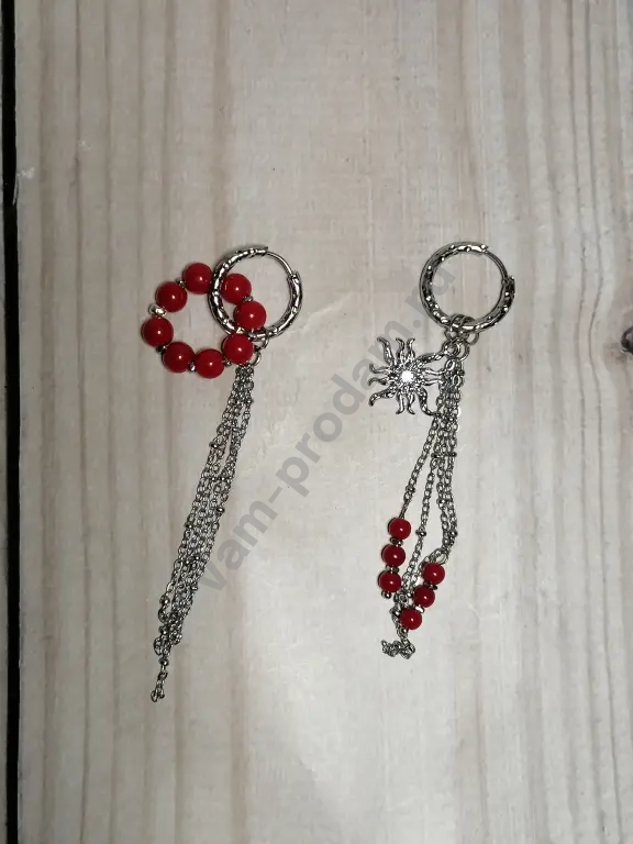 * **Правая серьга:** выполнена в виде кольца из ярких коралловых бусин, дополненного длинными серебристыми цепочками. Круглая форма создаёт гармоничный баланс с «солнечной» серьгой.