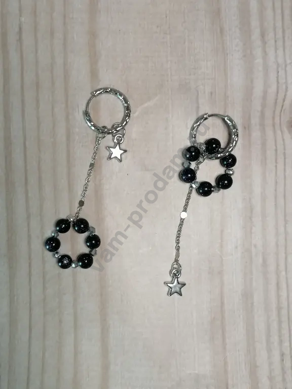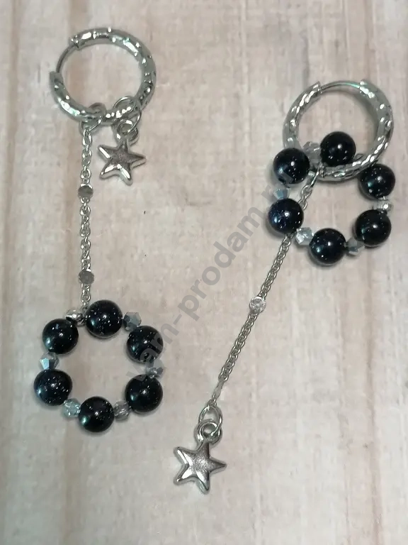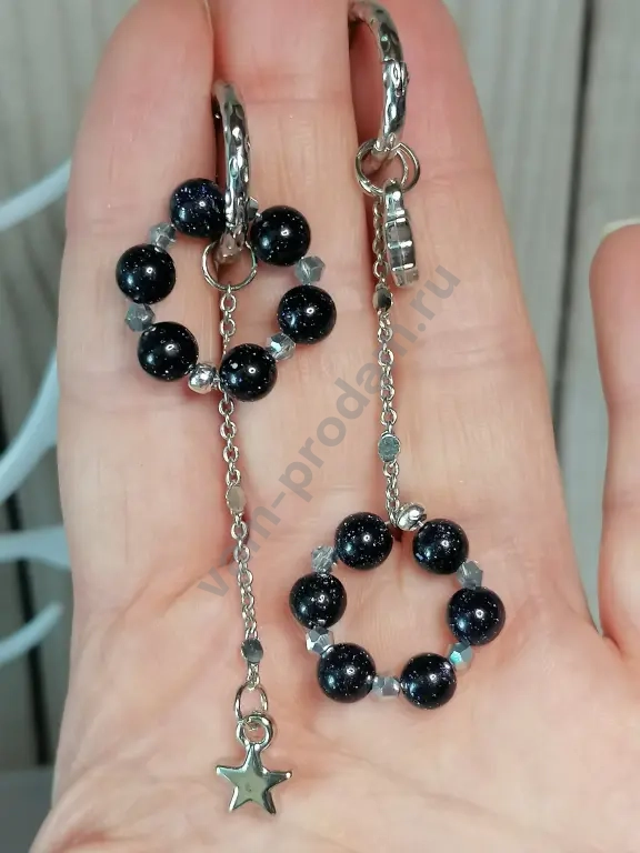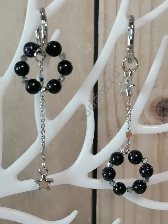 Модный хит сезона — ассиметричные серьги конго «Звёздные мечты»! Сочетание элегантности и игривости: каждая серьга уникальна, но идеально дополняет другую. В дизайне — изысканные подвески с чёрными бусинами из авантюрина и сверкающими звёздочками на цепочках. Подвески взаимозаменяемы — создавайте свой неповторимый образ!