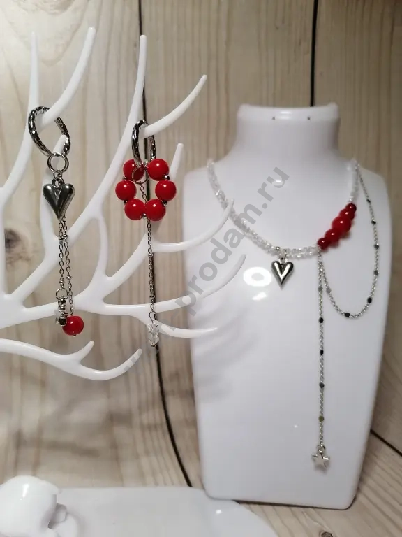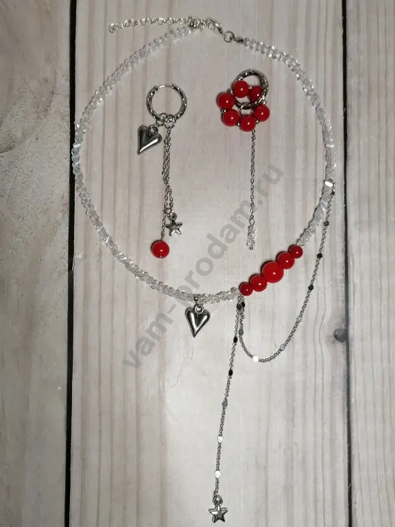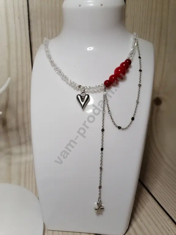 ✨ **Чокер из алмазного стекла** — воплощение элегантности и современности. Прозрачные бусины переливаются на свету, создавая эффект драгоценного украшения. Акцентные **коралловые бусины** добавляют яркости и свежести, а **подвеска в виде сердца** из полированного металла придаёт комплекту нотку романтичности. Асимметричная цепочка с миниатюрной звёздочкой делает дизайн уникальным и трендовым.
