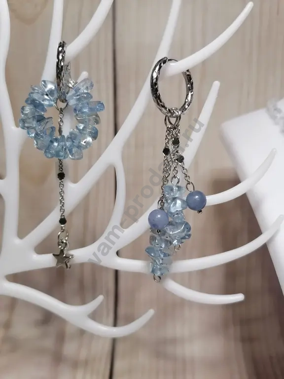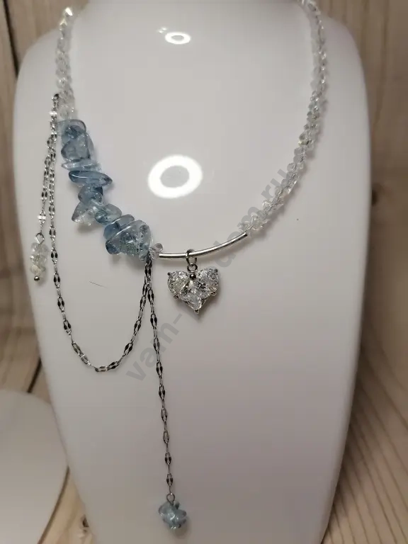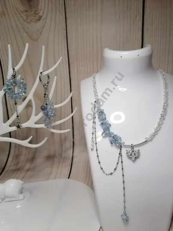 ✅ **В комплекте:** чокер и асимметричные серьги-конго с бусинами из аквамаринового кварца.