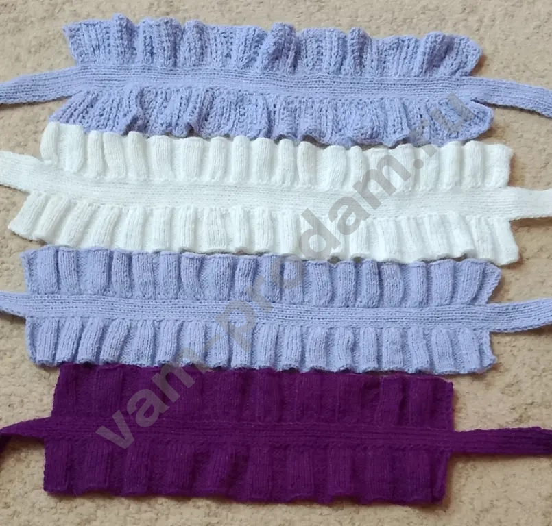 Связаны из пуха норки (90% ангора, 10% полиамид) белоснежного,голубого и насыщенного фиолетового цвета в одну нить. Поэтому изделие легкое, слегка пушистое, тепленькое, но не на сильные холода. Лучше носить весной или осенью.