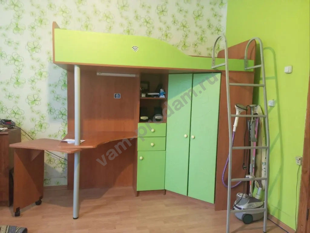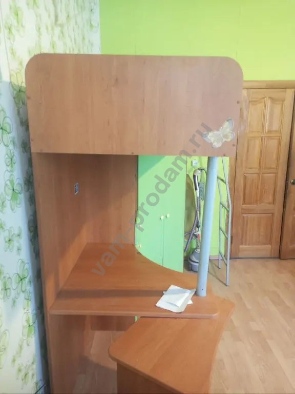Продам кровать-чердак. Внизу- угловой вместительный шкаф и раздвижной стол, наверху-полноценное спальное место 90 *200. Состояние нормальное, есть небольшие следы детского вандализма)