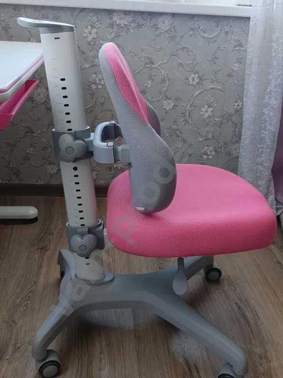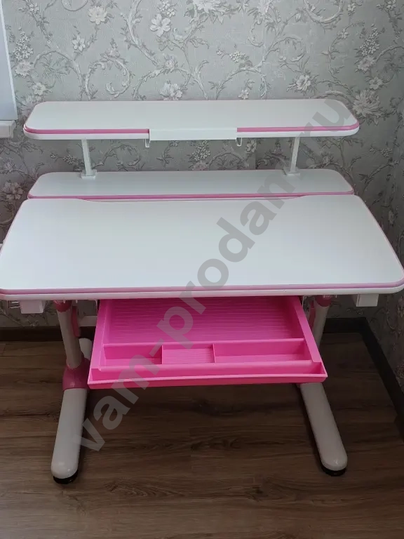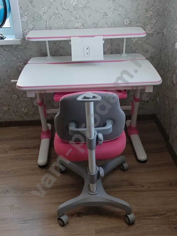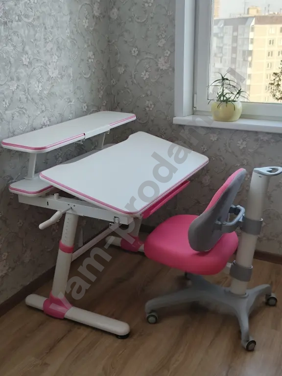 Продам б/у растущую стол-парту : регулируемая высота - до 80 см. , регулируемый угол наклона столешницы, крючок для рюкзака, выдвижной пластиковый ящик для хранения канцелярских принадлежностей. Регулируемое ортопедическое кресло после химчистки. Некоторые пятна на кресле не поддаются химчистке.