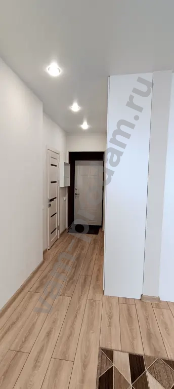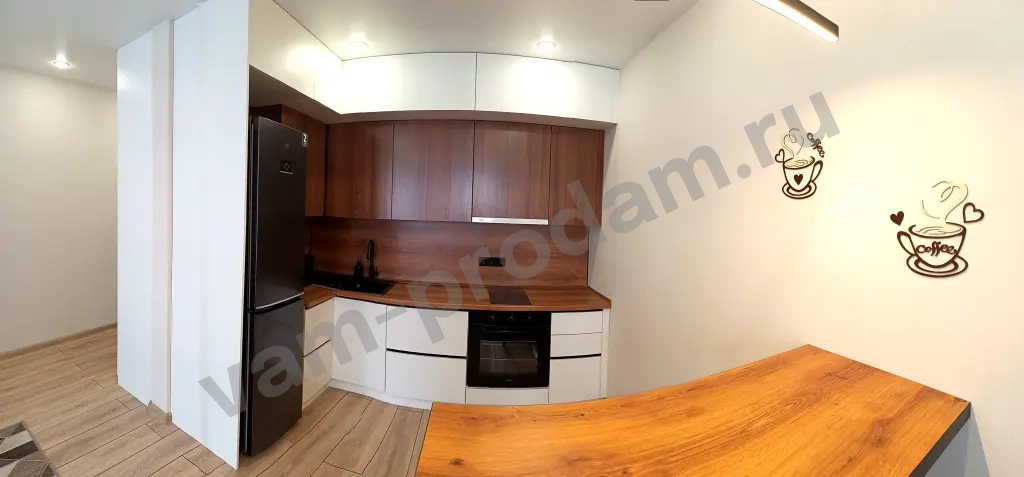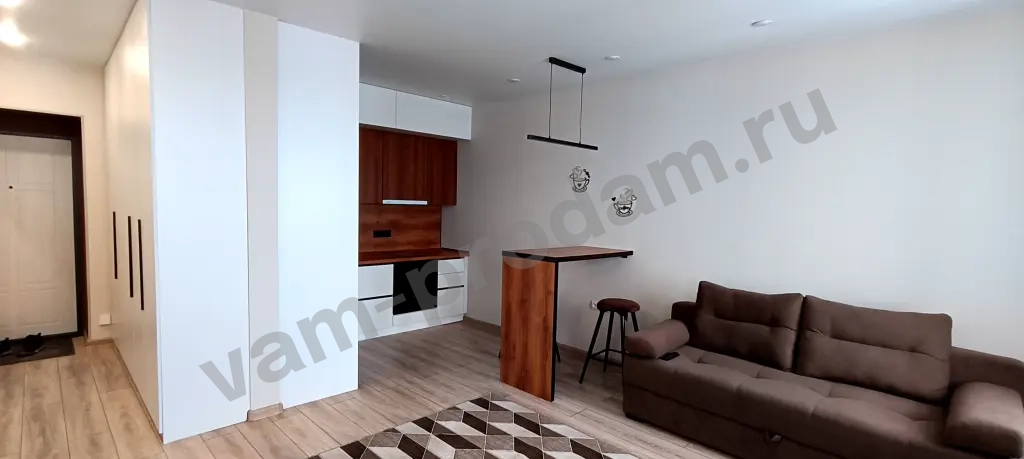 Барный стол с 2 стульями, который разделяет зону отдыха и зона готовки. Встроенный вместительный шкаф в коридоре из трёх секции.