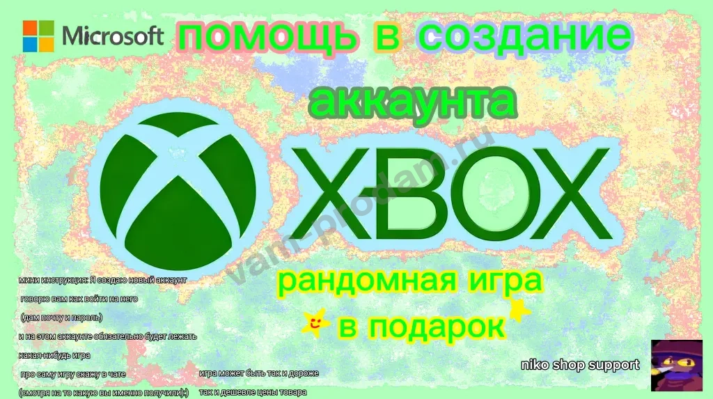 я предоставляю вам услугу помощи создания учётной записи xbox , небольшая инструкция: Я создаю аккаунт даю вам от него почту и пароль далее я вам показываю что и куда нажимать что куда вводить на аккаунте также может быть запрятана любая игра так от дешёвый до дорогой на аккаунте может быть сразу несколько игр первому покупателю скидка 40% оплата по телефону или по карте т-банк