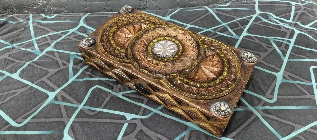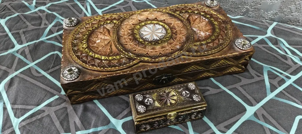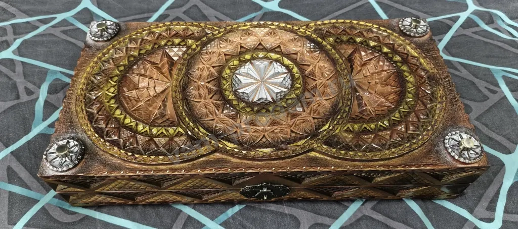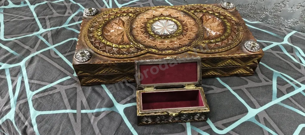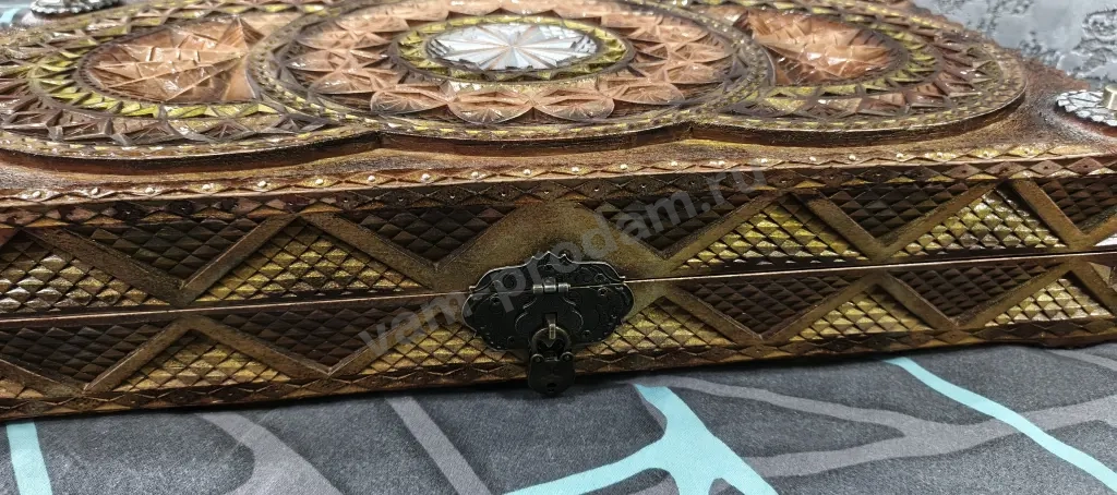 В комплект к Резным Нардам идет коробочка под хранения фишек, она так же резная и обклеена бархатом. Вся коробка полностью в Ручной Резьбе, отличный подарок для близкого Вам человека.