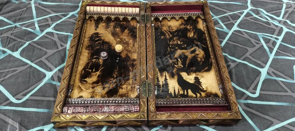Фишки резные обклеены бархатом, плюсом в комплект идет по одной запасной фишки. Внутри самой коробки на полях два рисунка выполнены на Pyro Printer X волк и медведь. Все это закреплено резными штапиками.