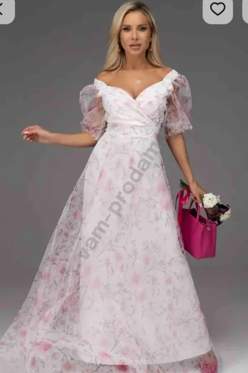 Платье для выхода, выпускного, торжественных выходов. Верх сетка. Длина в пол. Рукав до локтя. Красивое декольте. Нежный розовый цвет с прином цветов.