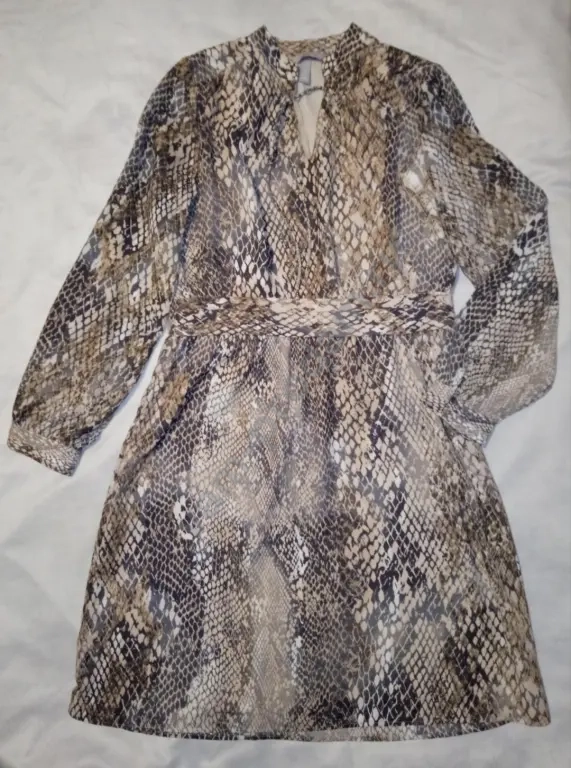 Платье на подкладке, одевалось пару раз, длина по спинке 103см, длинный рукав на манжетах пуговицы, на талии по спинке широкая резинка. Подойдёт на 48-50р.