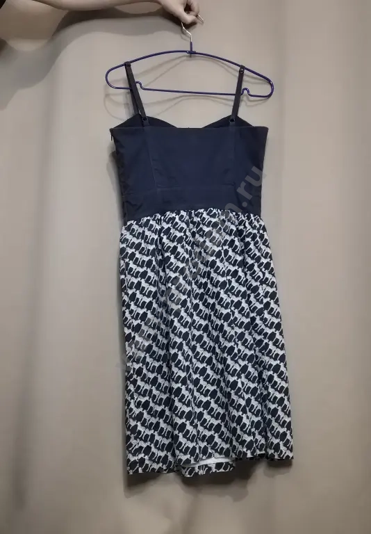 Лёгкое летнее платье на тонких бретельках для стройной фигуры. Верх тёмно-синий, низ с принтом «зебра». Платье подчёркивает талию и смотрится очень женственно.