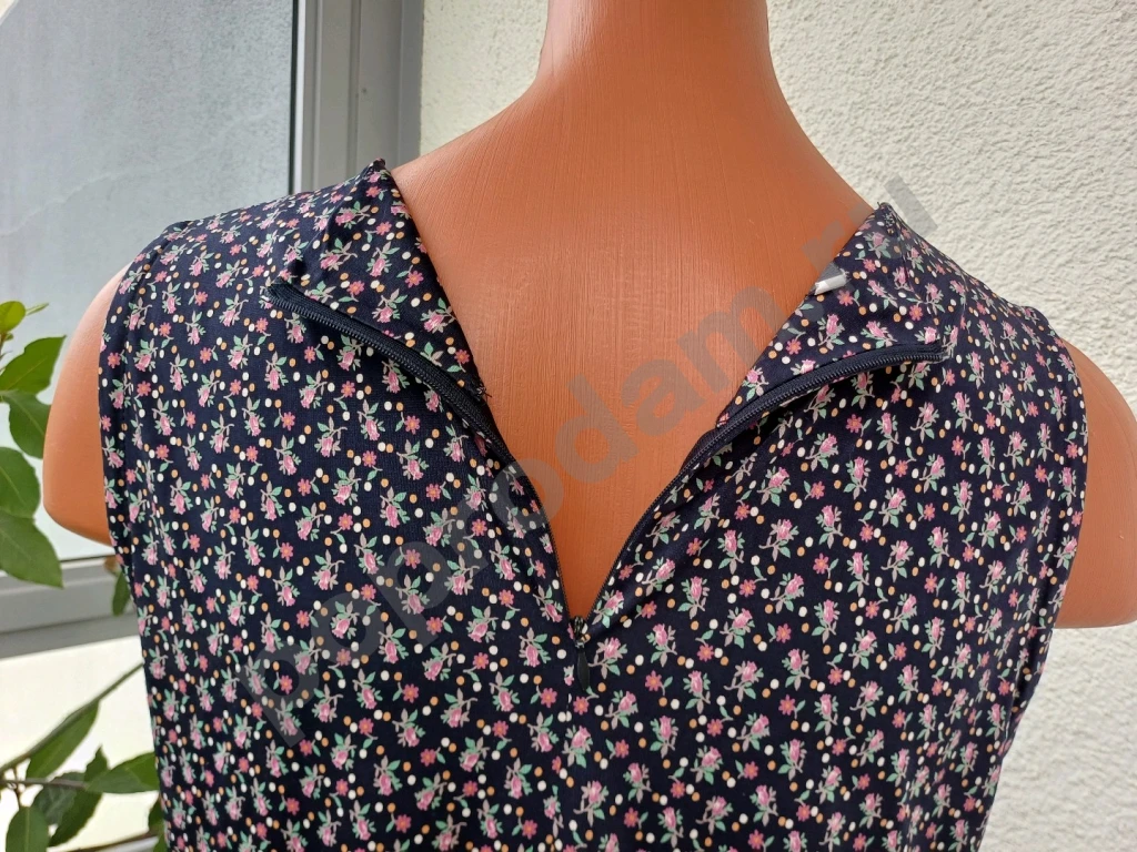 Платье-сарафан свободного кроя, книзу немного расширяется. Сзади, в верхней части спинки, есть молния.