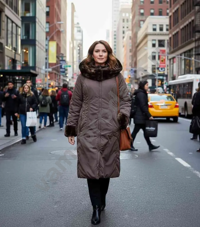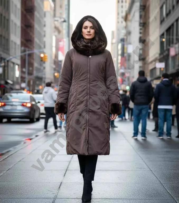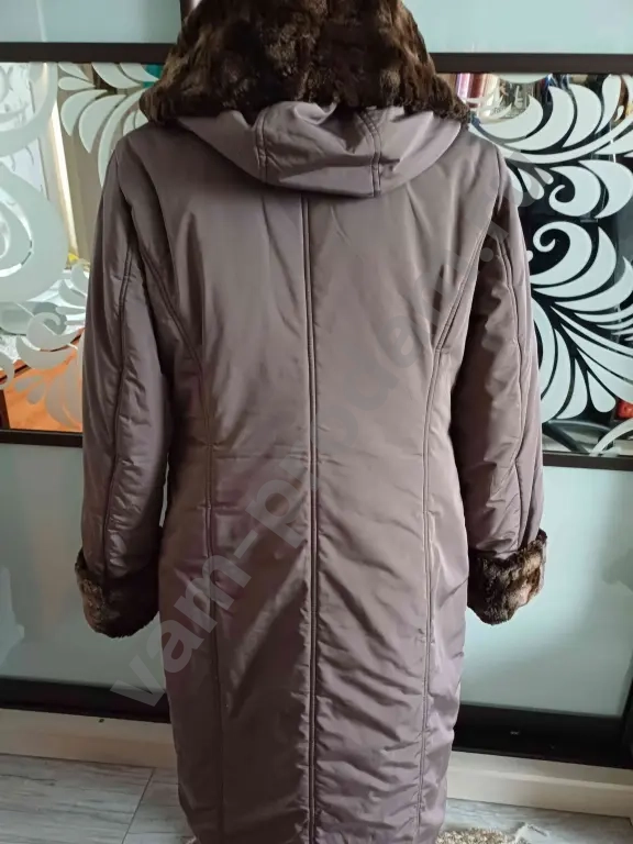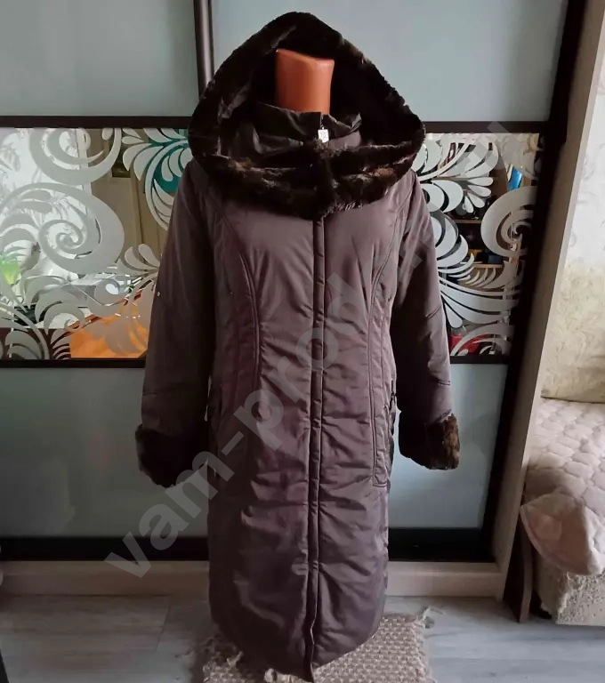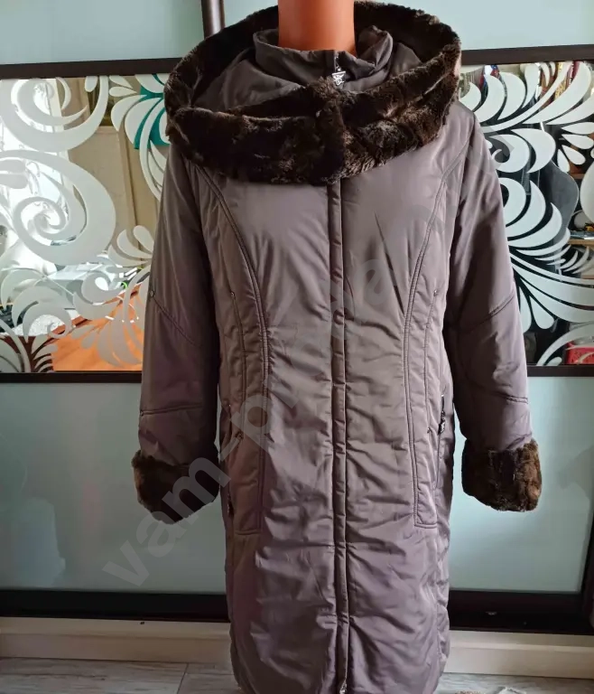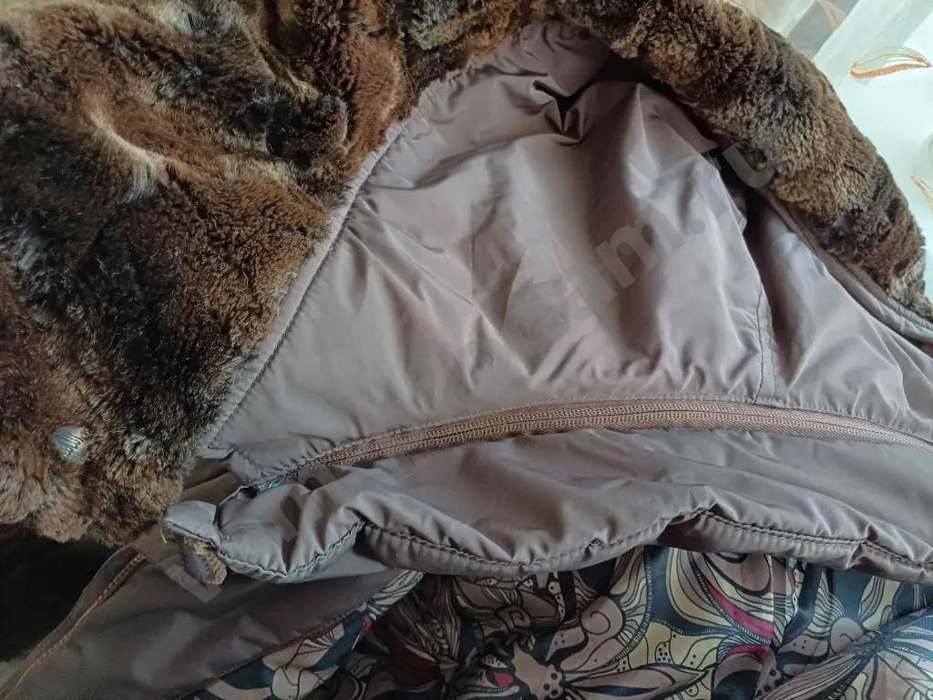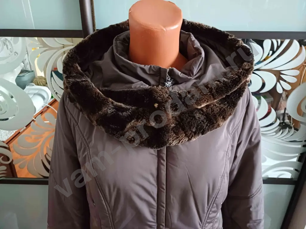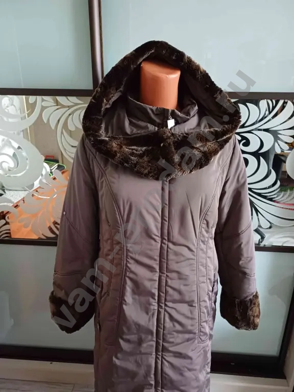 Имеет глубокий капюшон с широкой опушкой из искусственого меха.