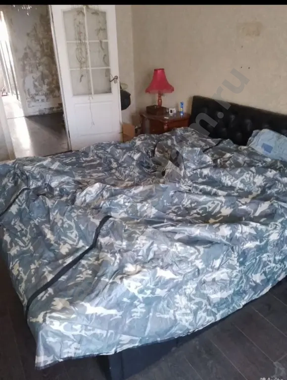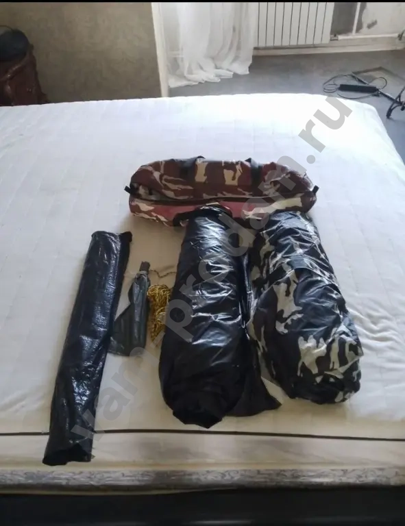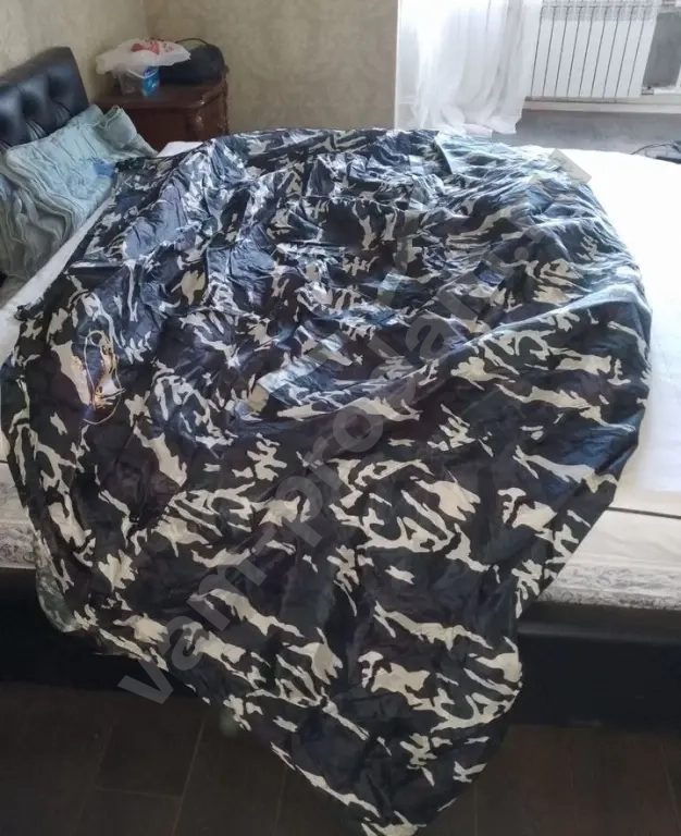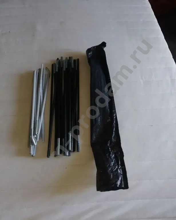 Кровать на которой раскинута палатка 2.2х2 , ещё свисает ...., присутствуют колышки и каркасные усилители в черном пвкете .