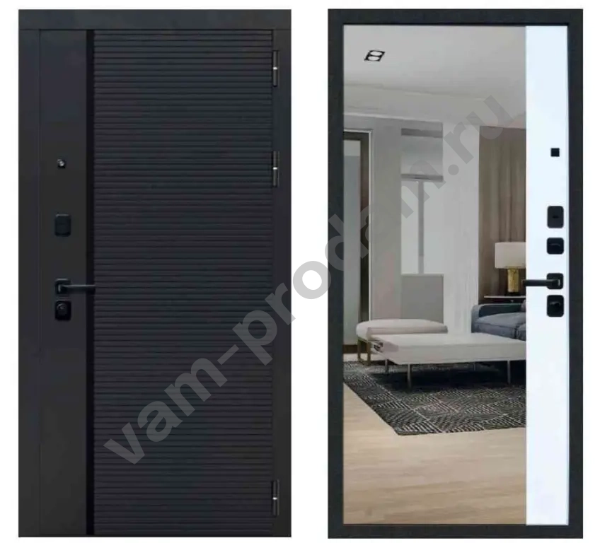 В наличии 960х2050 левая. 3 контура уплотнения, 2 замка:сувальдный + ключ барашек, ночная задвижка. Металл 1.5мм. Снаружи панель 10мм, внутри панель с зеркалом 16мм.