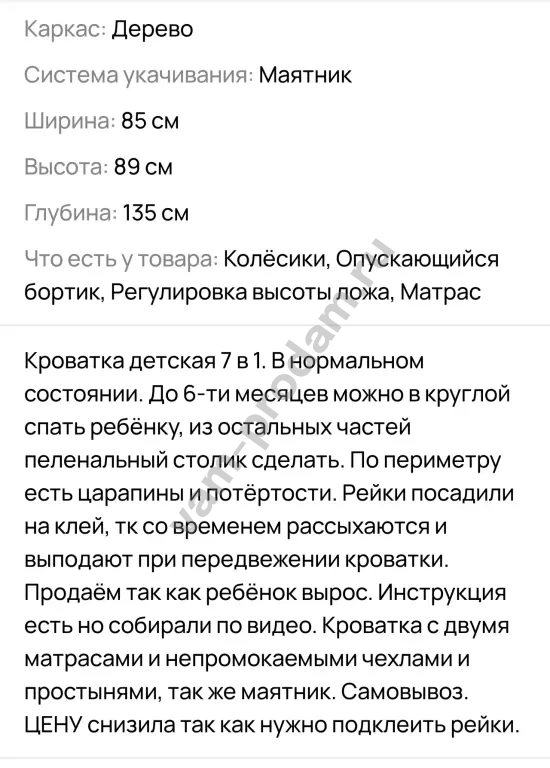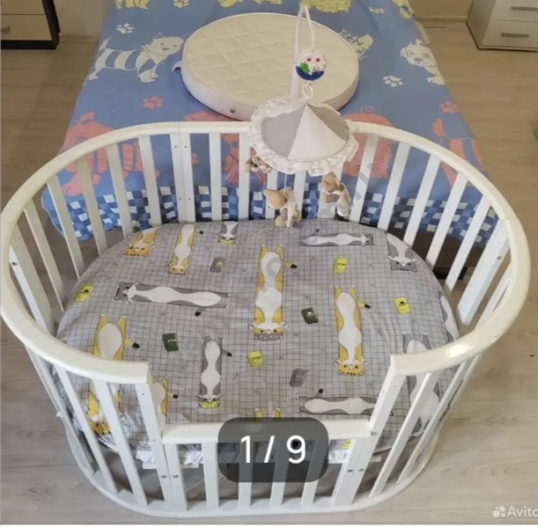 Кроватка в нормальном состоянии. Есть потёртости, нужно садить рейки на клей. В комплекте кровать, два матраса, маятник, наматрасник, простыни.Самовывоз.
