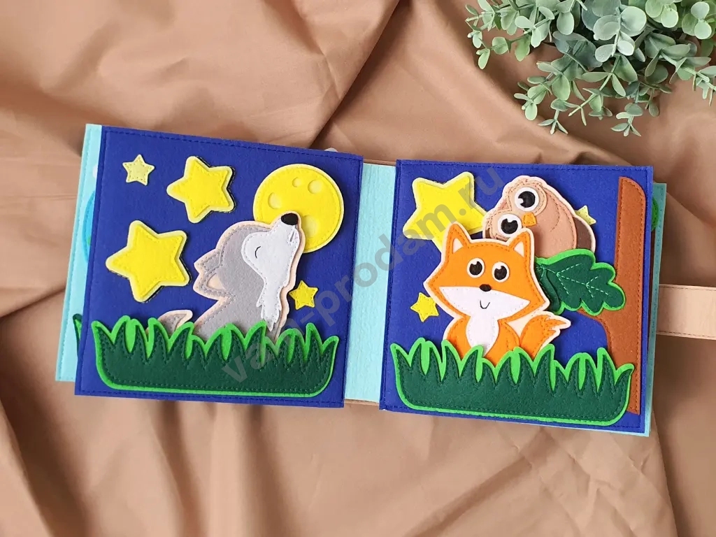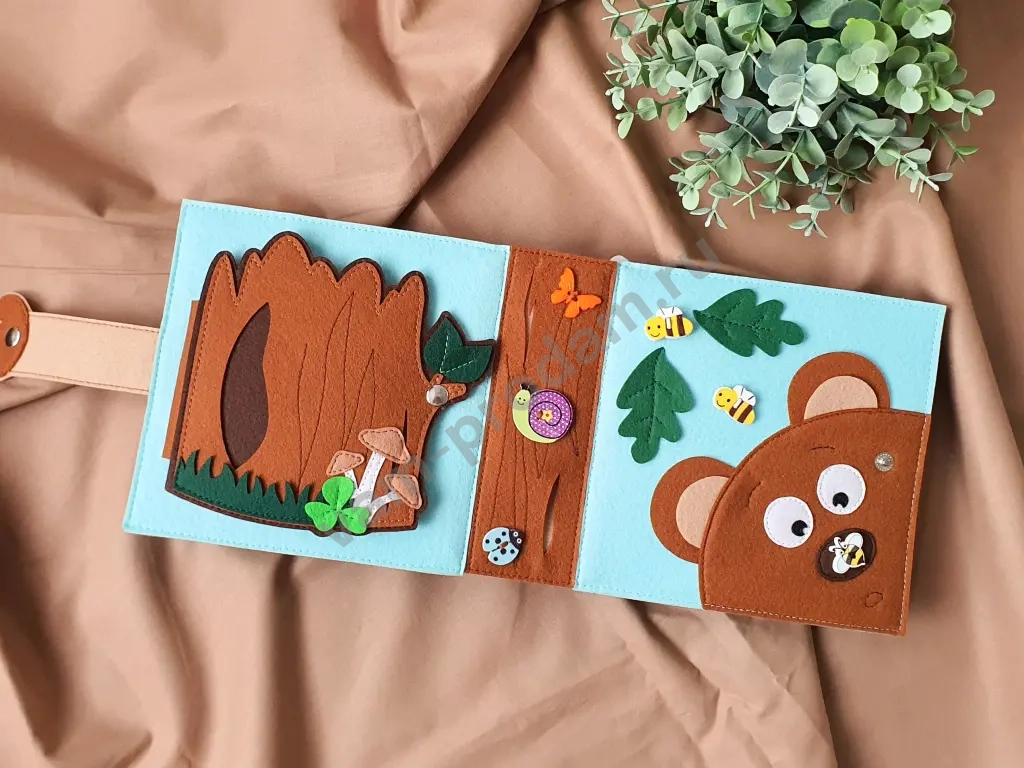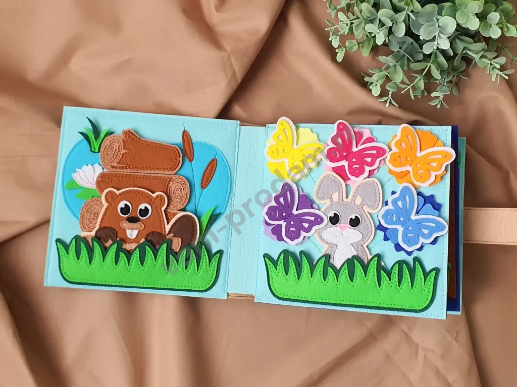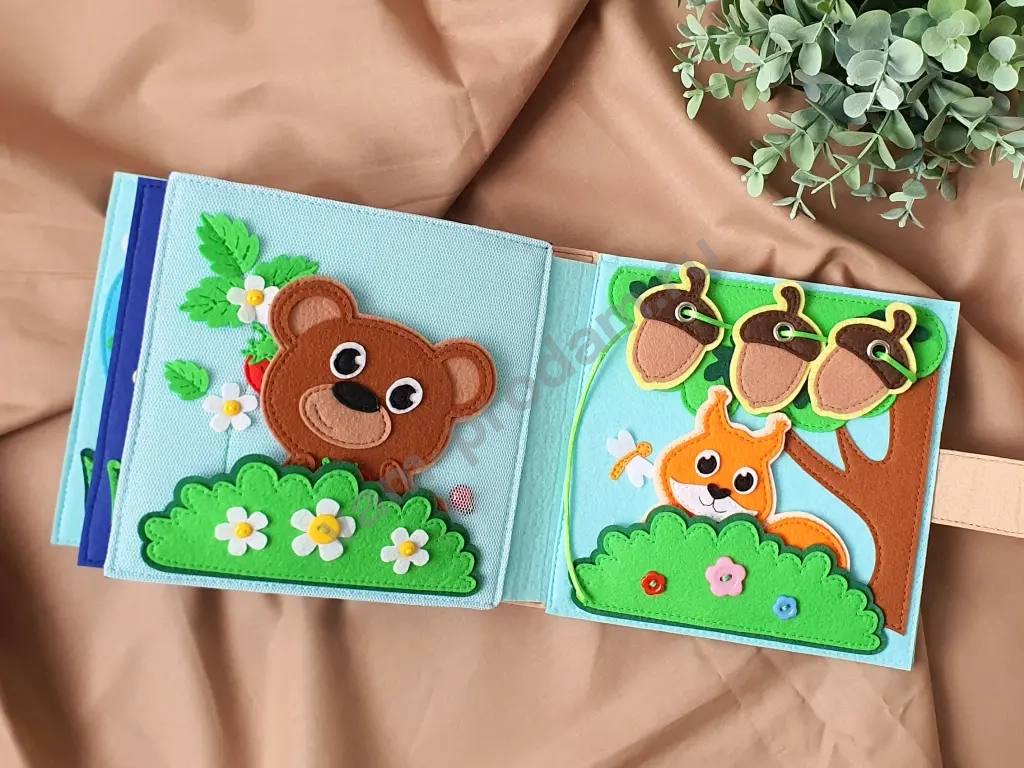 А ещё, каждый зверёк научит малыша чему-то новенькому: бобр - строить пирамидку из брёвен, зайчик - выучить цвета, волк - освоить магнитную кнопку, лиса с филином - определять размеры (большой, средний, маленький), медвежонок - передвигать бусинки под сеткой, белочка - шнуровать, ёжик - перебирать пайетки.
