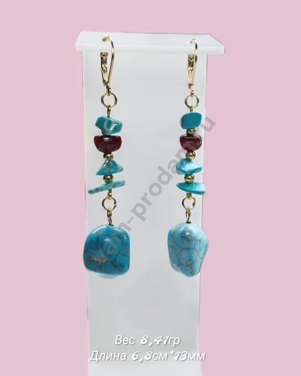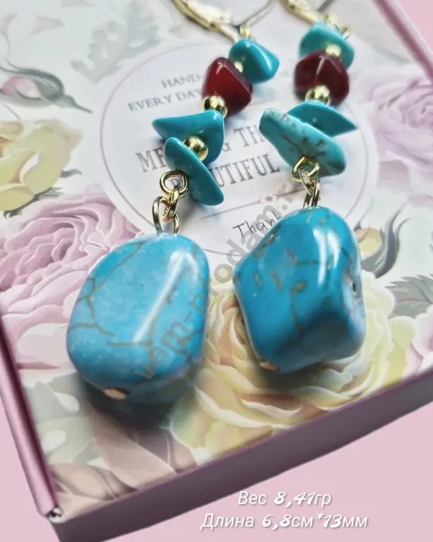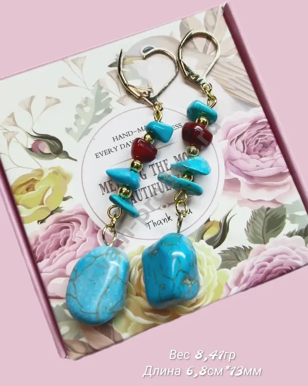 Серьги выполнены в стиле ручной работы: крупные бирюзовые камни завораживают своей природной красотой, а вкрапления красных акриловых бусин добавляют яркости и индивидуальности. Фурнитура под золото придаёт украшению благородный блеск и обеспечивает надёжность крепления.
