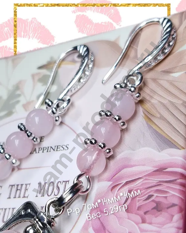 * материал: розовый кварц (бусины 4 мм), стекло (элементы 8 мм), металлическая оправа и подвески;