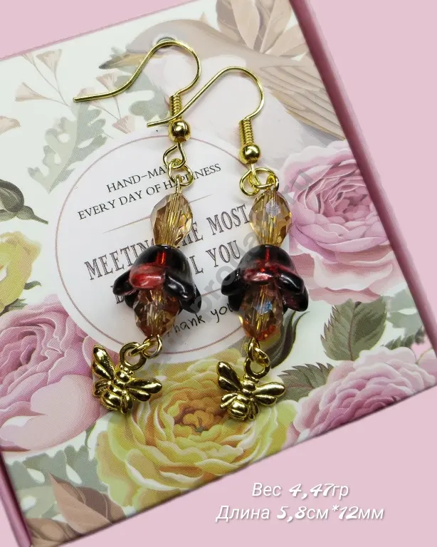 - **Дизайн:** утончённые серьги с комбинированными элементами — полупрозрачные бусины тёплых оттенков гармонично сочетаются с чёрными декоративными элементами в форме цветочков.
