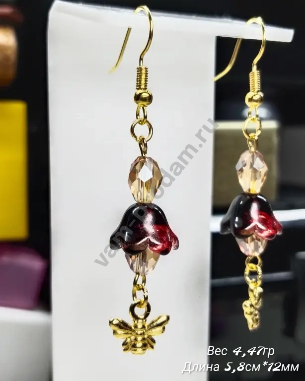 - **Подвески:** золотистые фигурки пчёлок придают украшению особый шарм и делают его неповторимым.