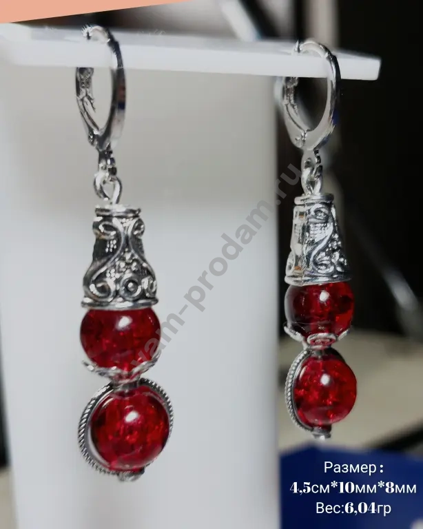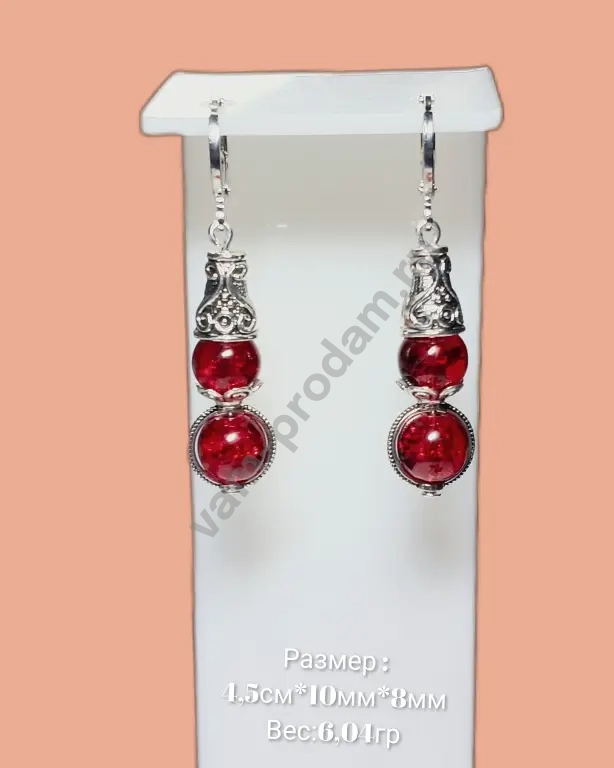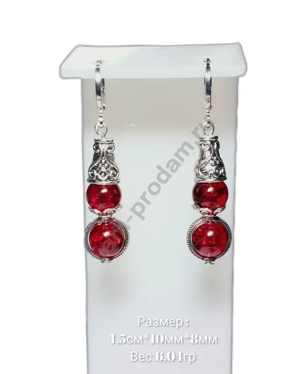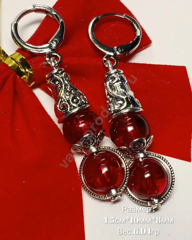 Эта изысканная пара украшений сочетает в себе утончённость металлических элементов с глубоким, насыщенным оттенком вишнёвых стеклянных бусин.