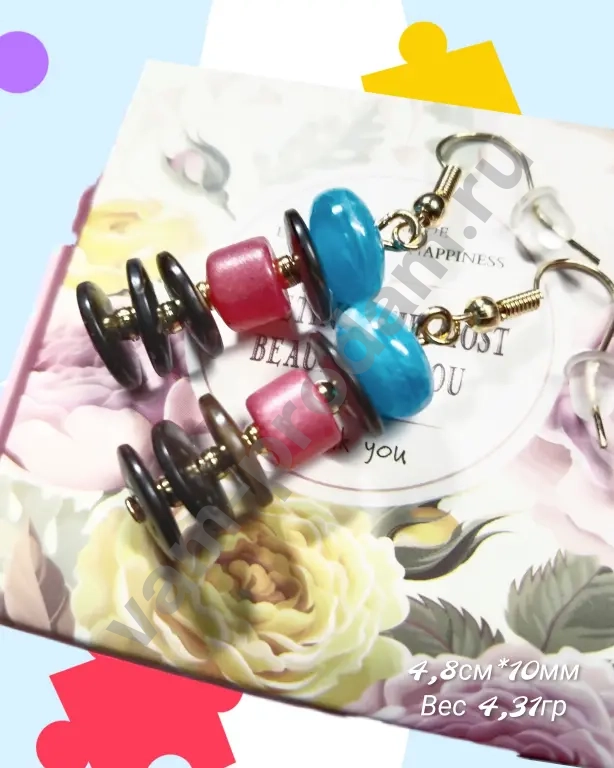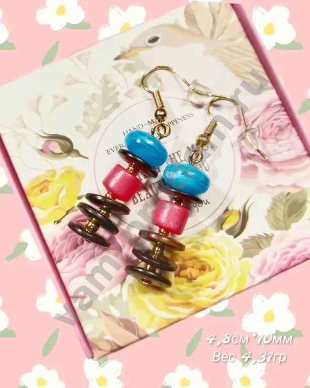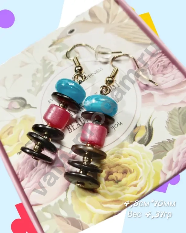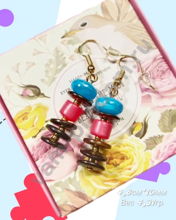 Серьги привлекают внимание сочетанием насыщенных оттенков: сочные голубые и розовые бусины чередуются с элегантными деталями из кокосового дерева. Спиральная форма элементов придаёт украшению динамику и оригинальность, а лаконичные крючки обеспечивают удобство ношения.