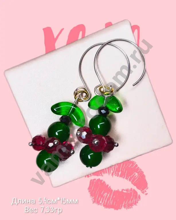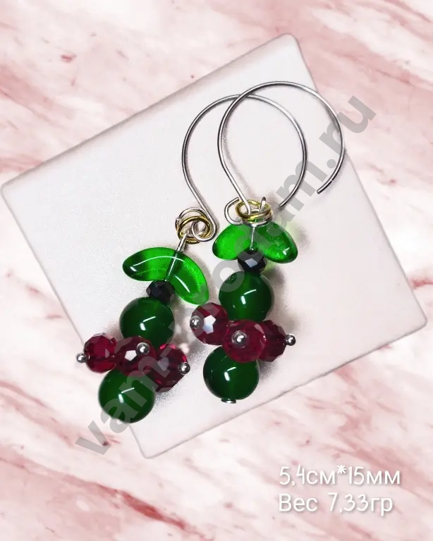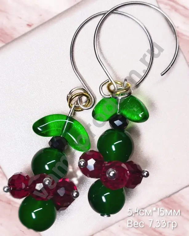 Материалы: сочетание глянцевых зелёных и гранёных бордовых бусин с металлическими элементами.