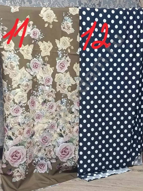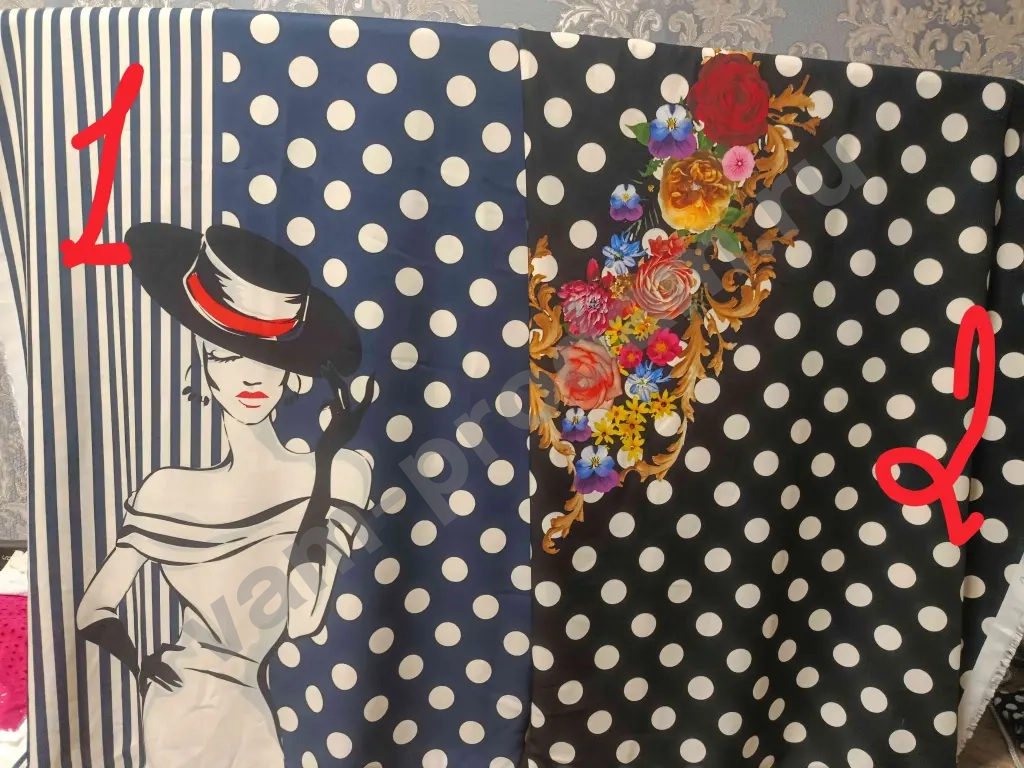 1 и 2. Ткани привезены из Испании, производство Италия, купонные отрезы по 1.3 м, по 1200 руб. Заберете оба, отдам за 2000 руб.