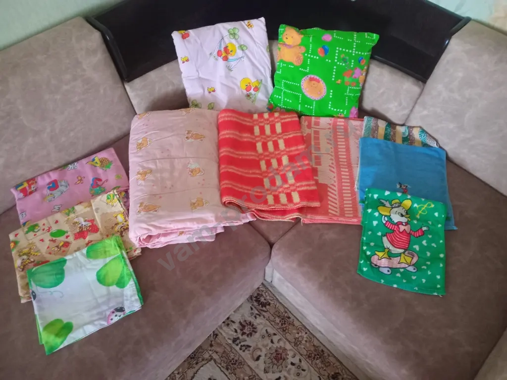 Постельный набор в детскую кроватку: 2 теплых одеялка+2 пододеяльника, 2 подушки+ 2 наволочки, покрывало, полотенца.