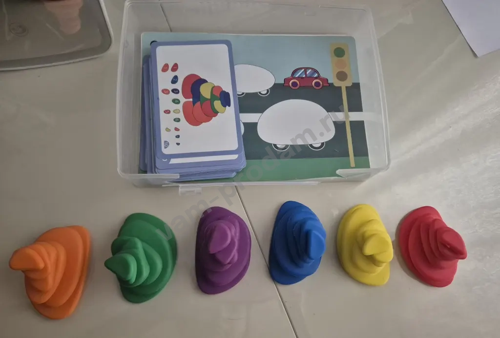 В наборе радужные камушки и 2 комплекта карточек. Отличная развивающая игра для ребёнка.
